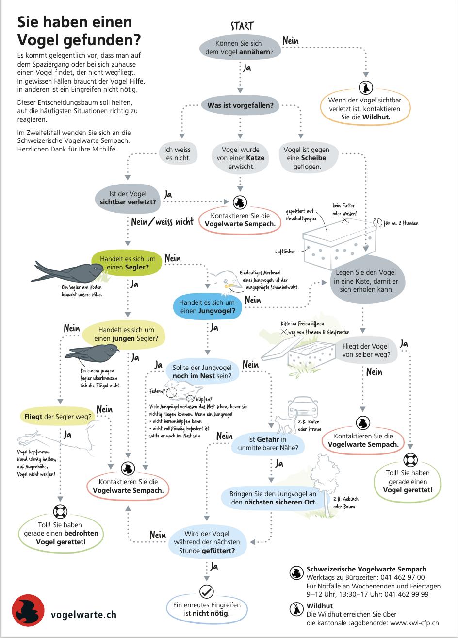 Die Schweizerische Vogelwarte Sempach betreibt eine eigene Pflegestation. Diese kann unter Tel. 041 462 97 00 (Mo-Fr 8-12 Uhr und 13.30-17 Uhr) erreicht werden; an Wochenenden und Feiertagen ist ein Pikettdienst organisiert (9-12 Uhr und 13.30-17 Uhr).