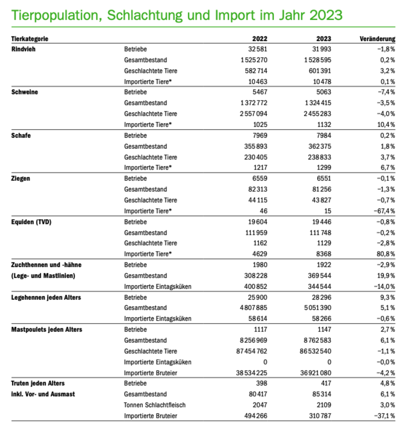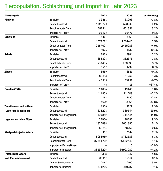 Im Jahr 2023 wurden in der Schweiz 47'719 Landwirtschaftsbetriebe gezählt, ein Rückgang von 1,3 % im Vergleich zum Vorjahr. Der Biolandbau wächst weiter: 7896 Betriebe, also 16,5 %, wirtschaften biologisch und bewirtschaften fast einen Fünftel der landwirtschaftlichen Nutzfläche. Die Tierbestände zeigen unterschiedliche Trends. Die Anzahl der Milchkühe sank um 2 %, die Schweinebestände um 3,5 %, während der…