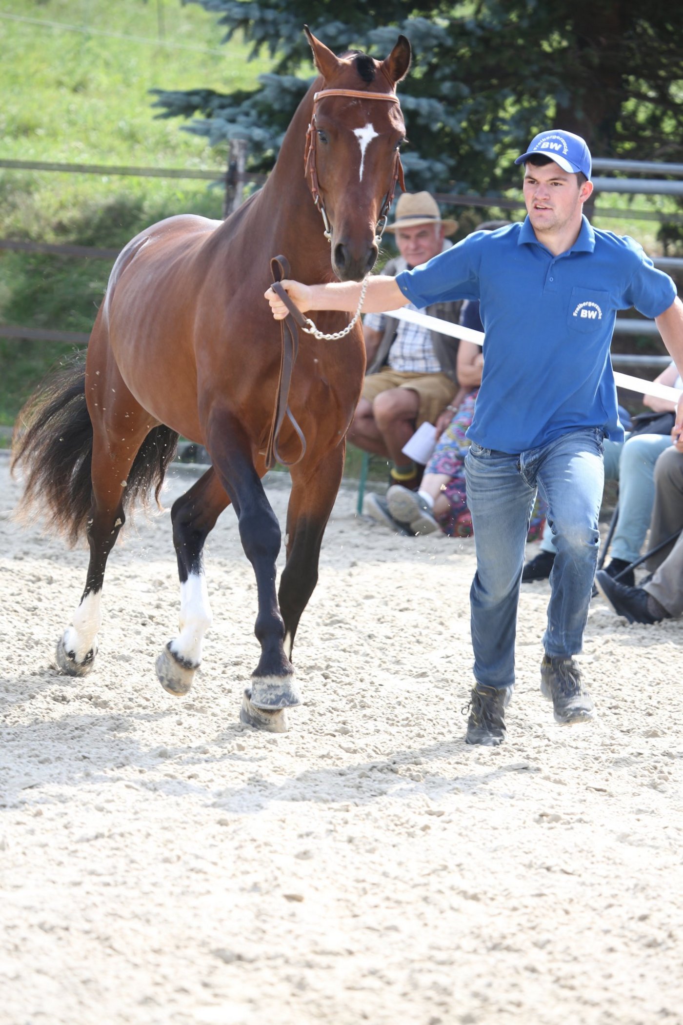 Nach den zwei Rappels im mit Sonnenblumen geschmückten Schauring gehörte die Bühne einem ganz anderen jungen Star. «Happyboy BW» (Hayden PBM) gab sich die Ehre, der im Februar 2019 geborene Zuchthengst im Besitz von Michael Wüthrich. Dieser Hengst hat sich «gemacht», ist stattlich und elegant geworden. Mit viel Elan und Schwung präsentierte er sich an der Hand seines jungen Besitzers.[IMG 6]
