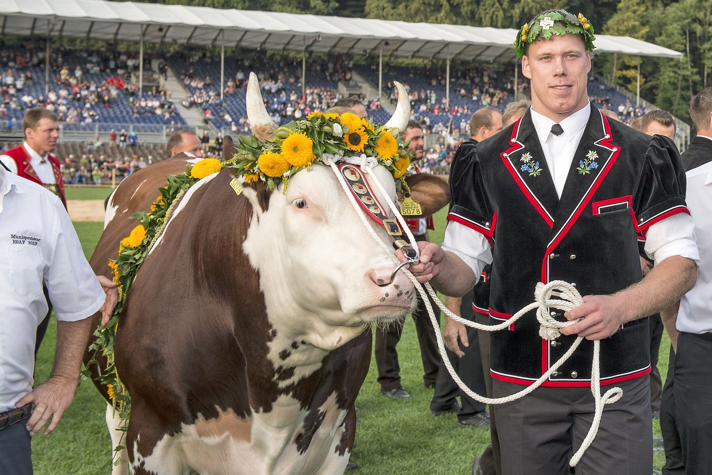 Der Schwingerkönig 2013 Matthias Sempach mit seinem Lebendpreis Fors vo dr Lueg. (Bild Matthias Sempach)