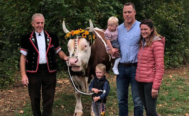 Fors vo dr Lueg war bekannt für sein gutmütiges Wesen.  Hier posiert der Muni mit Matthias Sempach und seiner Familie sowie dem langjährigen Muni-Betreuer Hans Bichsel (links). (Bild Matthias Sempach)