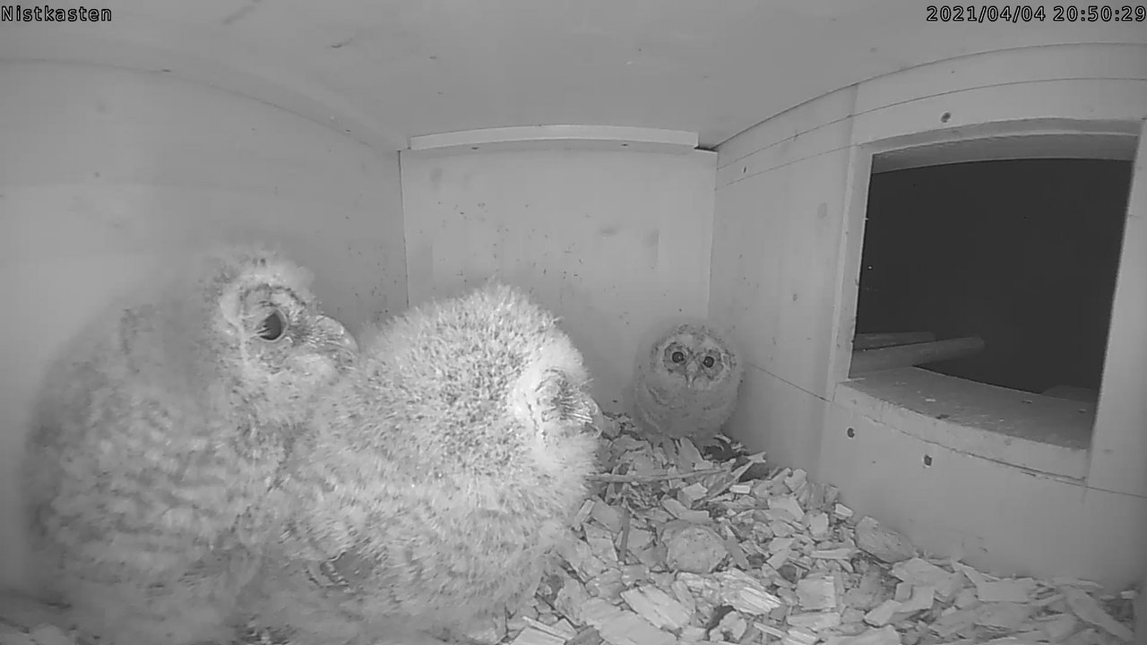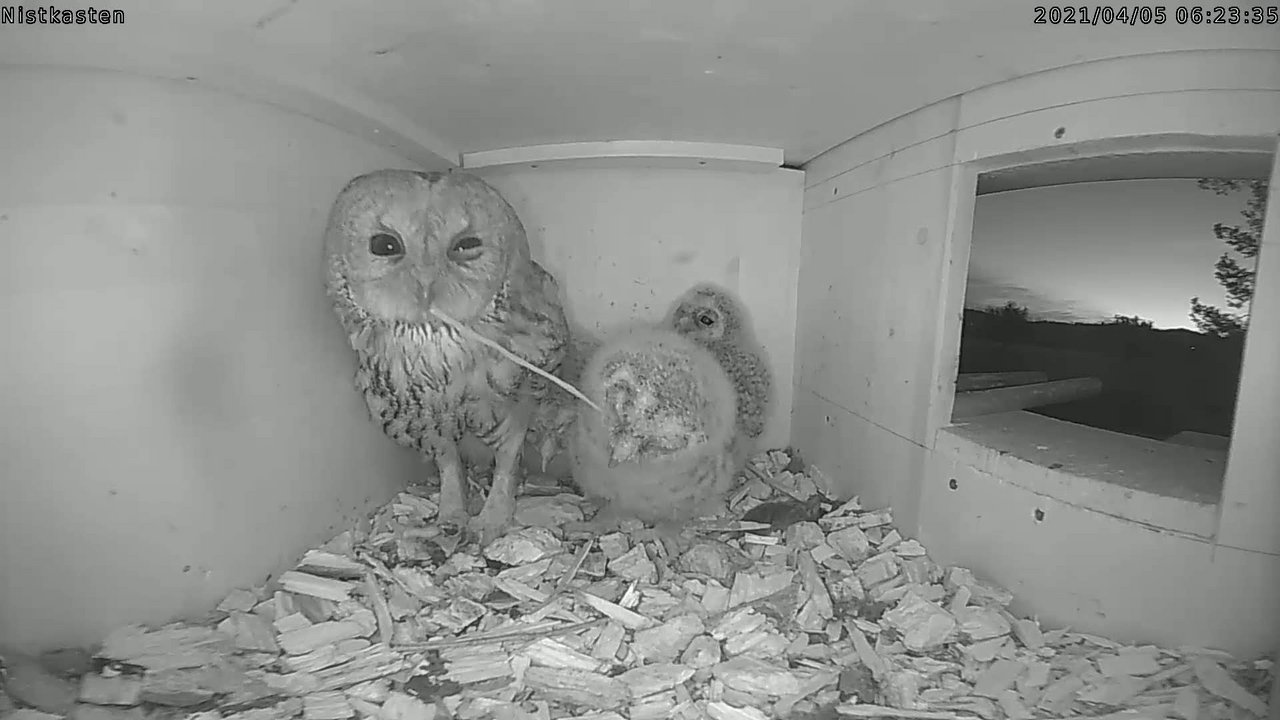 Seither besucht das Vogelpaar regelmässig den Kasten, das Weibchen legte Eier und mittlerweile kann man im Livestream flauschige Käuzchen beobachten.
