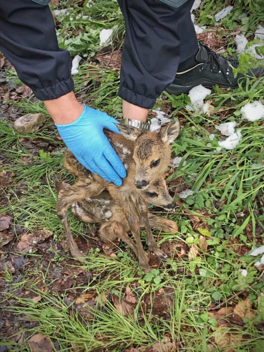 Die Passantin informierte die Stadtpolizei St. Gallen, nachdem sie das Rehkitz im Wald gefunden hatte. Als die Polizei eintraf und das Rehkitz aufheben wollte, raschelte es in der Böschung und ein zweites Rehkitz purzelte den Hang hinunter.