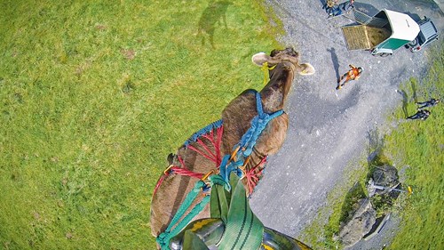 Wenn Kühe mit dem Helikopter transportiert werden, sind die Tiere mit enormen Reizen konfrontiert. Das Rotoren-Geräusch ist laut, die Temperatur und der Luftdruck können während des Fluges stark schwanken, die Tragegurte engen das Tier ein. Hinzu kommt, dass Kühe meist dann per Helikopter transportiert werden, wenn sie stark verletzt sind. Die Belastung der Verletzung oder der Krankheit kommt also ebenfalls noch…