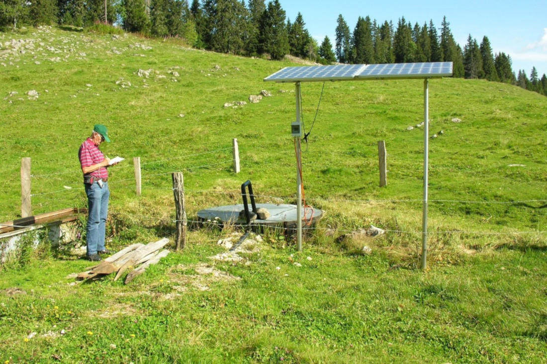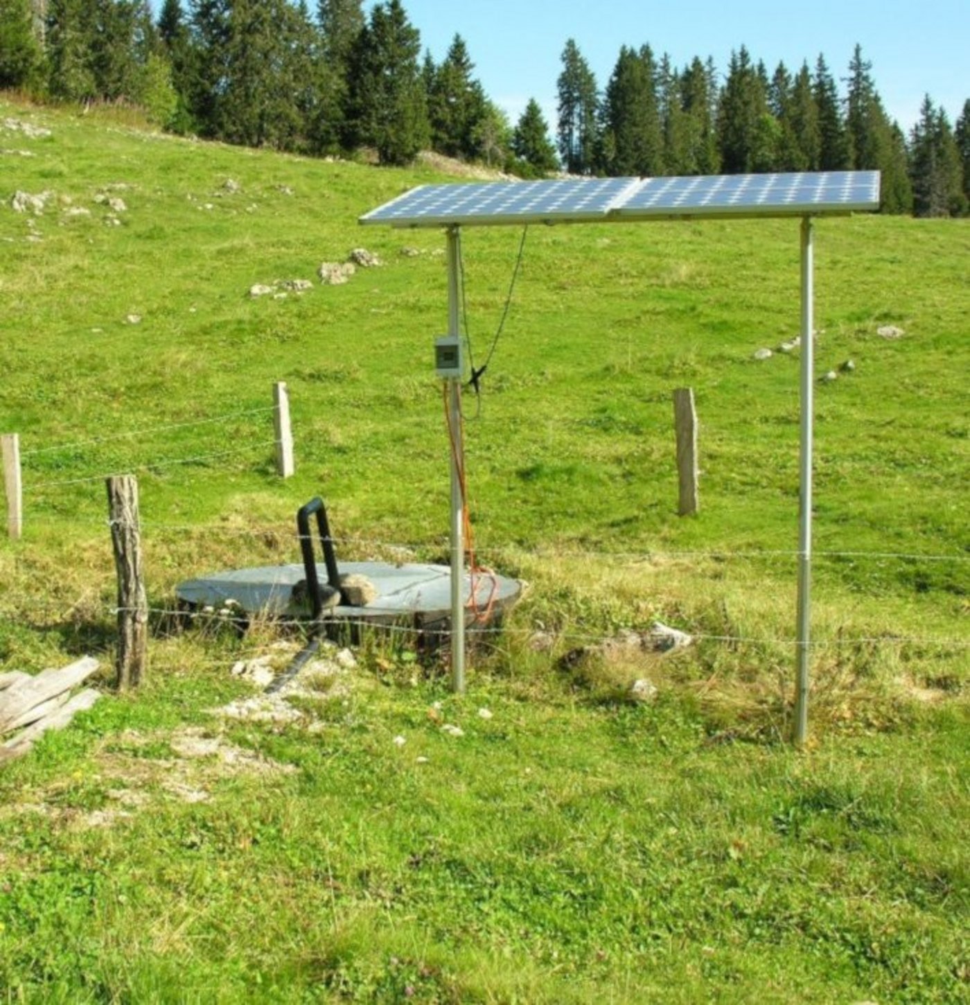 [IMG 2]Für die Wasserverteilung auf Weiden mit eher geringen Höhenunterschieden und ohne alternative Stromquellen sind Solarpumpen für die Versorgung von Tränkestellen geeignet. Der Einsatz photovoltaischer Anlagen bietet sich hier besonders an, da Sonneneinstrahlung und Wasserbedarf oftmals zeitgleich auftreten. Bei vielen solaren Pumpsystemen wird die Wasserpumpe direkt, das heisst ohne Speicherung des elektrischen Stromes, vom Solargenerator versorgt, da die Speicherung des geförderten Wassers in der Regel einfacher und kostengünstiger ist als ein elektrischer Speicher. Je nach Modell eignen sich Solarpumpen zur Überwindung von Höhendifferenzen zwischen 50 und 100 Metern. Die üblichen Modelle für Alpweiden haben eine Leistung von 5 bis 10 Litern pro Minute. Die Leistung muss optimal auf den Wasserverbrauch abgestimmt werden. Wasserquelle, Pumpe und Solarpanel sind vor dem Vieh zu schützen.