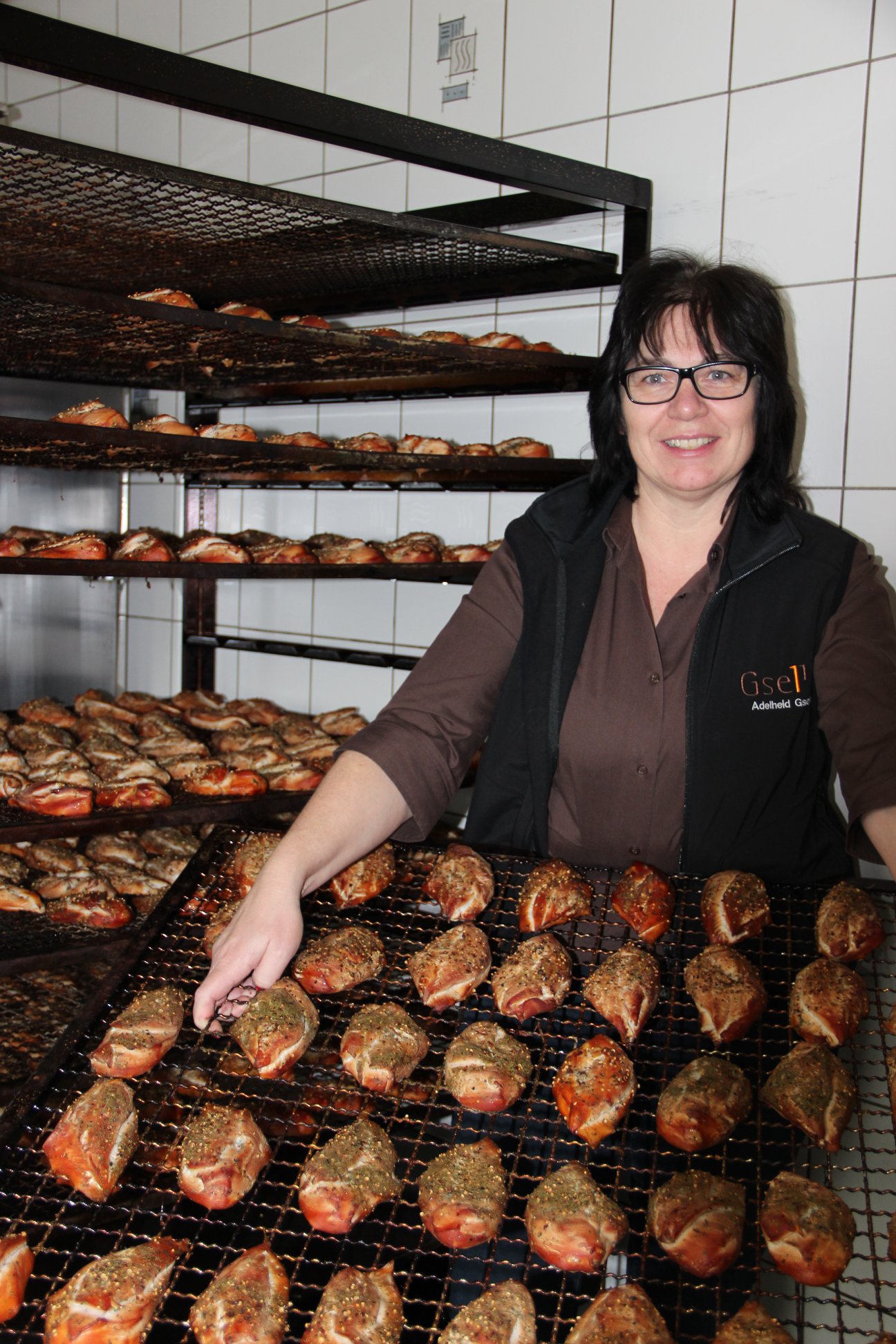 Adelheid Gsells Spezialität sind "g'räuchti Pouletbrüstli", sind die Spezialität von Adelheid Gsell. Gemeinsam mit ihrem Ehemann Werner Gsell bewirtschaftet sie einen 22 Hektar grossen Betrieb in Winden mit Schwerpunkt Pouletmast.