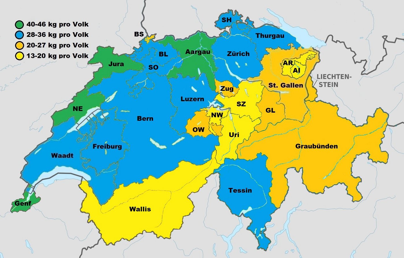 Dies ist die kantonale Verteilung der Gesamthonigmengen (Frühling und Sommer) in der Schweiz und im Fürstentum Liechtenstein: