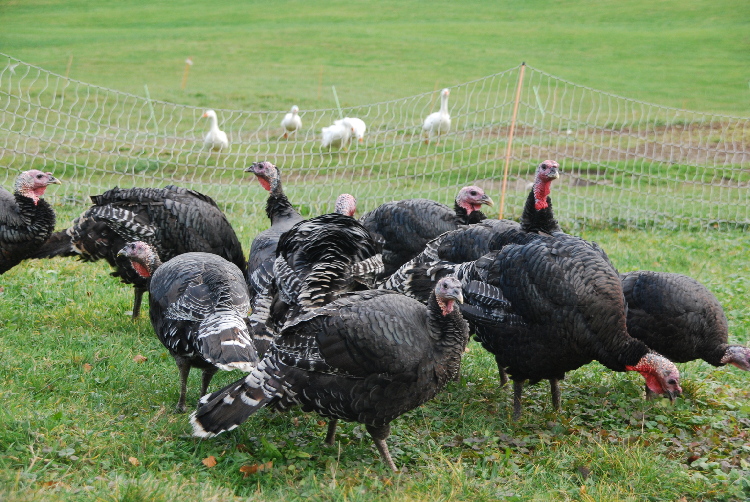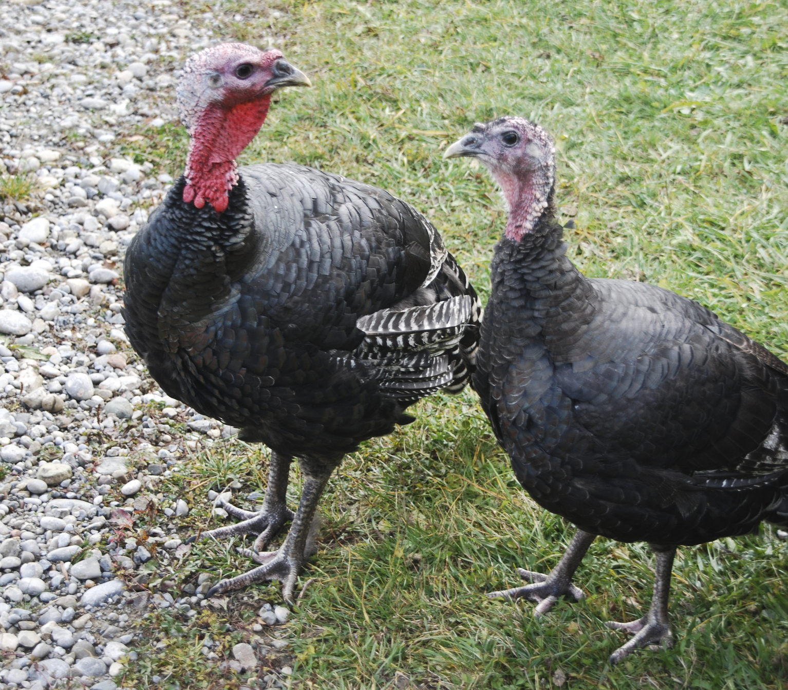 Im Stall können die Truten auf Holzlatten in die Höhe steigen und haben viel Stroh um sich. Auf der Weide finden sie ausreichend Gras, Würmer und sandige Wege. Hans Feuz ist es wichtig, dass im zugekauften Futter der Sojaanteil aus Europa stammt. Bewusst hat sich die Familie Feuz für die schwarzen Bronzetruten entschieden, die etwas leichter werden und näher an der ursprünglichen Form und deshalb weniger krankheits- und verletzungsanfällig sind. Denn auf dem ganzen Hof wird seit Jahren konsequent auf Antibiotika verzichtet. Wenn doch mal ein Tier krank wird, dann greift Ursula zu ihren homöopathischen Chügeli oder zu Heilpflanzen.