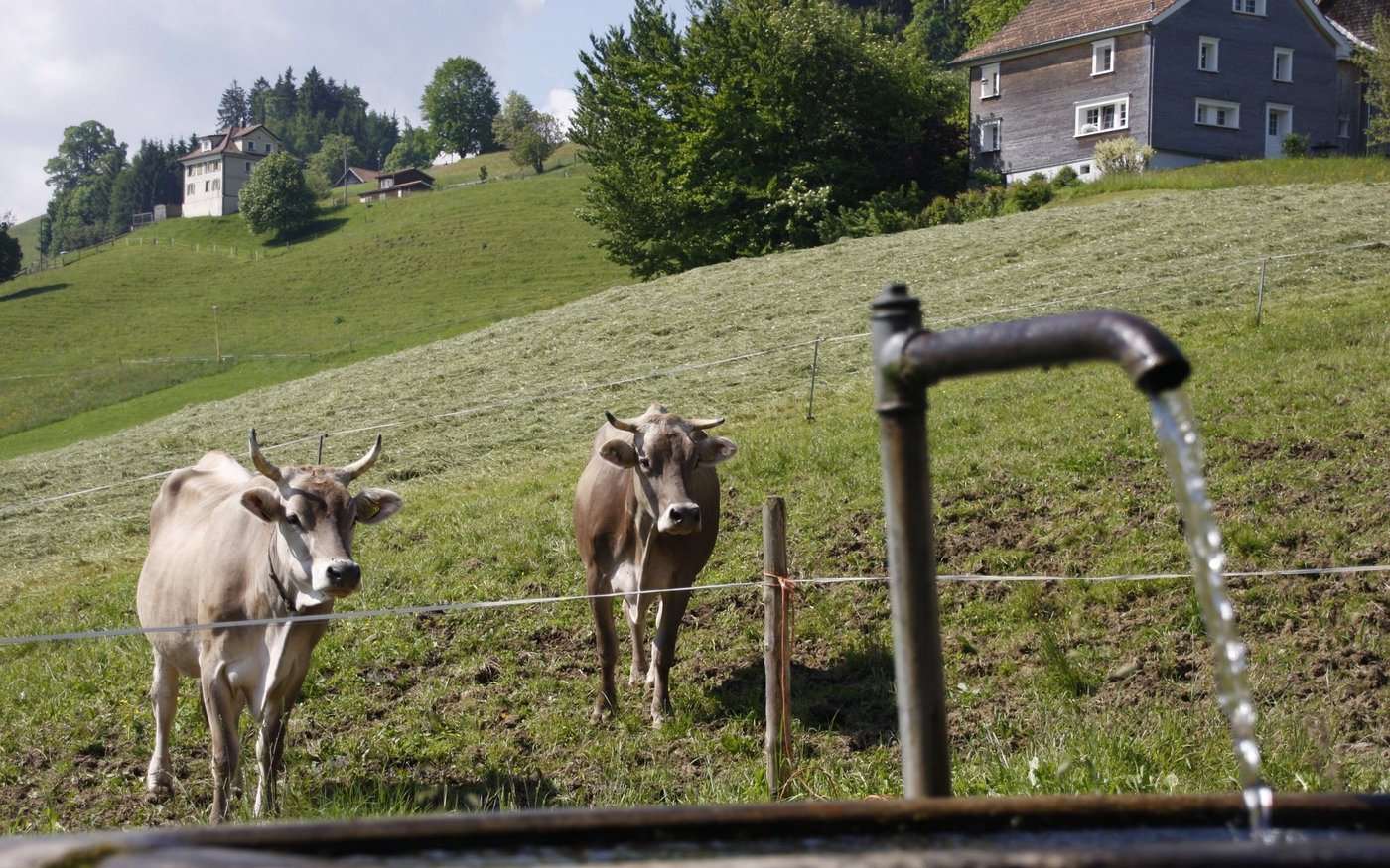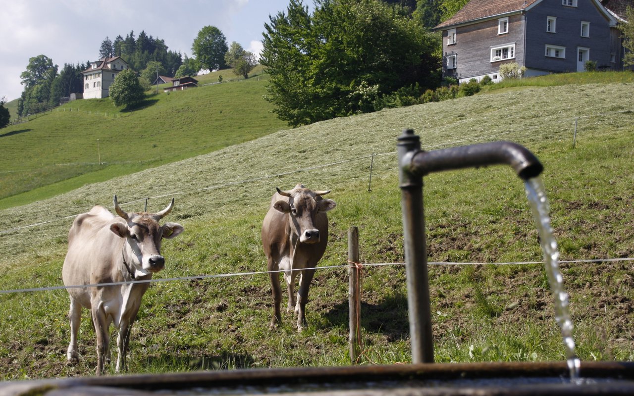 Ist es zu heiss, vermeiden die Kühe jegliche Anstrengung. Im Gegensatz zu den Schweinen liegen sie weniger und stehen lieber, damit sie die Wärme besser verdunsten können. Zusätzlich atmen sie stärker und schneller. Kühe können ausserdem schwitzen. Wenn das passiert, ist es aber meist schon zu spät und die Kuh leidet unter Hitzestress. All das ist anstrengend und setzt Flüssigkeit voraus. Schon bei normalen Temperaturen trinken Kühe bis zu 150 Liter pro Tag. Bei hoher Milchleistung und Hitze saufen sie sogar bis zu 250 Liter pro Tag.