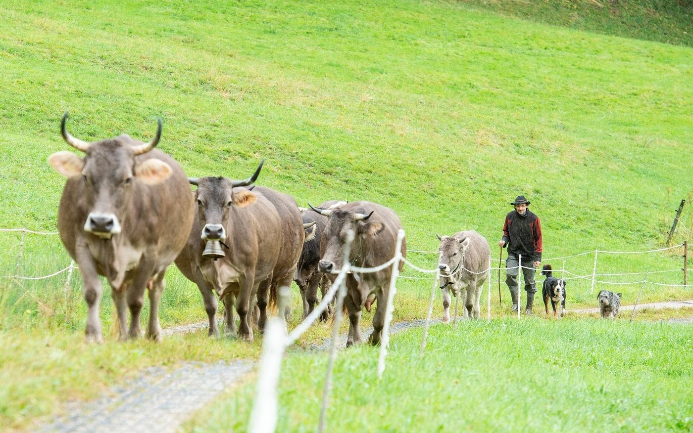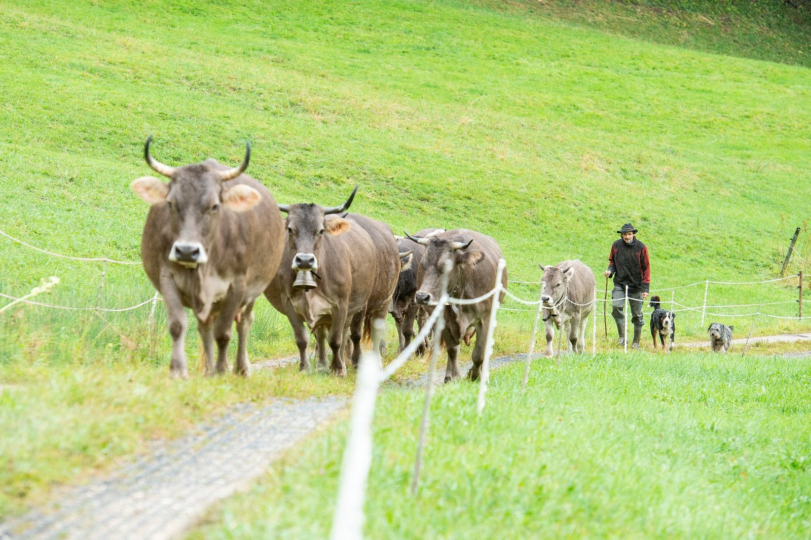 Viehbestand: 6 Original Braunvieh Kühe, 2 Rinder, 5 Kälber (4 Mast, 1 Aufzucht), 1 Stier, 23 Schafe mit Bock, 2 Esel, 8 Ziegen, 22 Hühner, 2 Hunde.