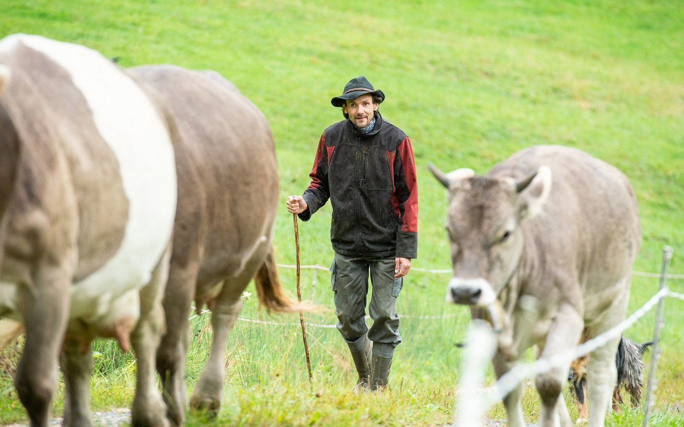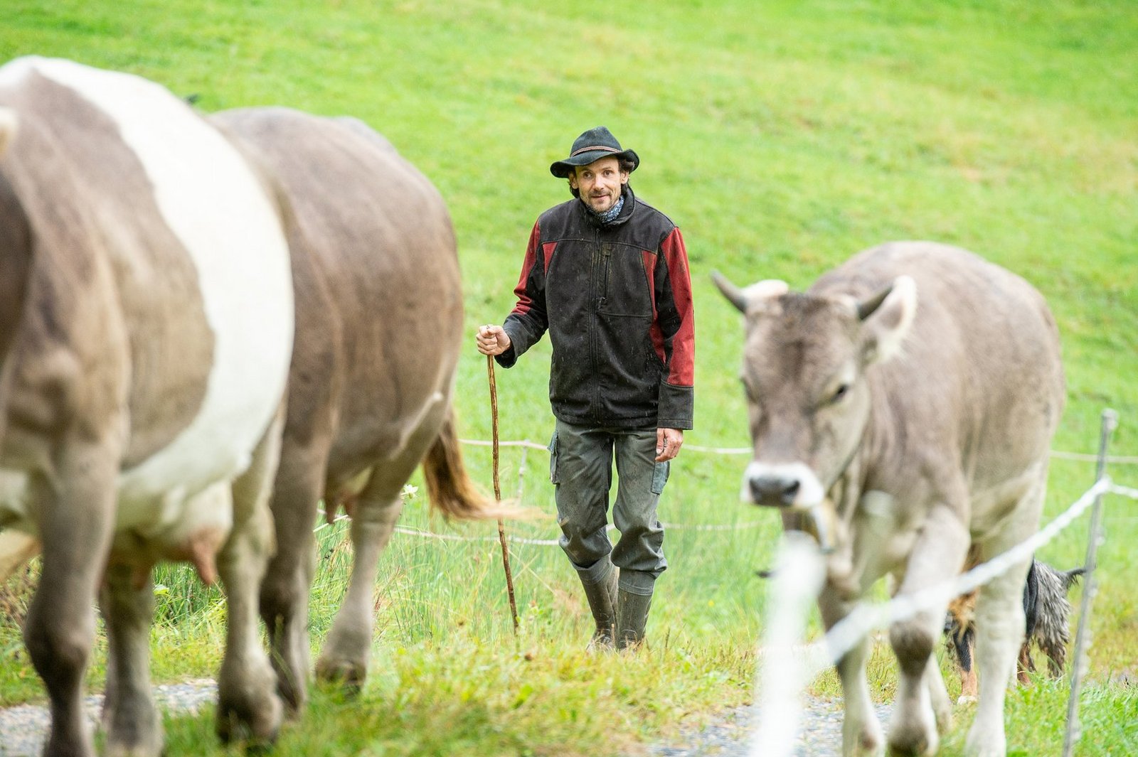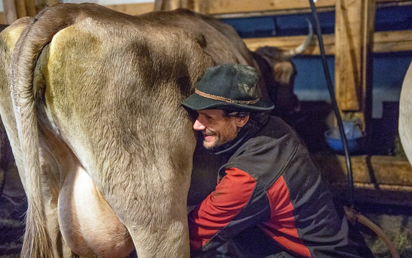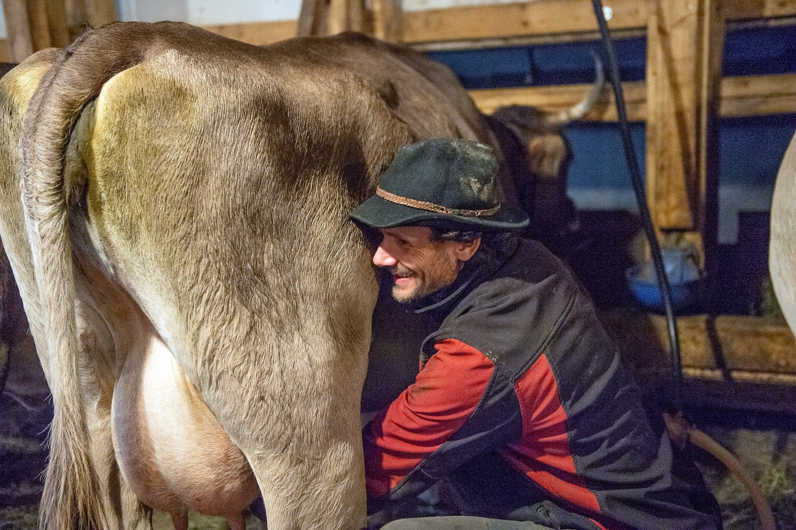 Das bedeutet für Donat Capaul, zweimal täglich die Kühe in den Stall bringen, zu melken und die Kälber zu den Ammenkühen zu navigieren. Durch das Anbinden und den dadurch engen Bezug zu seinen Tieren kann er diese überall anfassen und merkt entsprechend, wenn etwas nicht stimmt – oder er hört es bereits, wenn sie in den Stall kommen. Das sei ihm wichtig, unterstreicht er.