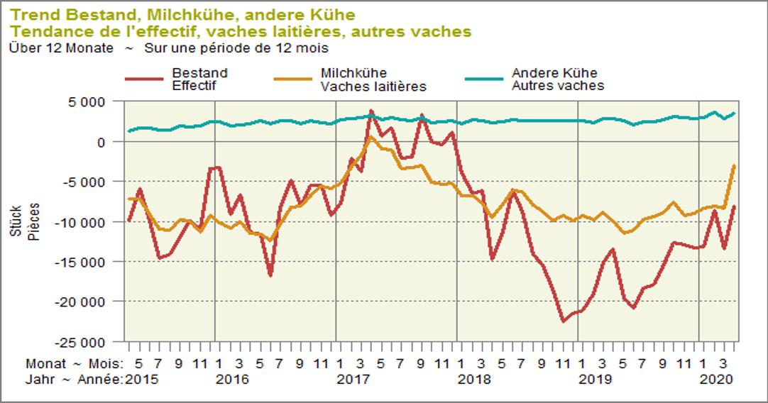 Daniel Erdin von Agristat sieht einen Zusammenhang zwischen der deutlichen Verlangsamung des Rückgangs beim Rindviehbestand in der Schweiz und der Corona-Krise. «Wahrscheinlich wurden die Schlachtungen während der Krise reduziert», schreibt Erdin. Gründe dafür seien etwa der Wegfall der überwachten Schlachtviehmärkte und zeitweilige Absatzprobleme beim Schlachtvieh.
