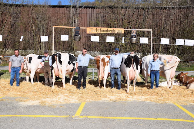 Landauf, landab finden zurzeit die Zuchtfamilienschauen statt. Über 300 sind es schweizweit dieses Jahr, davon ein grosser Teil im Kanton Bern. Sage und schreibe vier Zuchtfamilien (Allegro Canaria; Incas Cindy; Absolute Butterfly und Arrow Donau), konnten Christine und Jürg Streit aus Utzigen auf ihrem Betrieb präsentieren, eine davon schon zum zweiten Mal. Insgesamt waren es 25 Tiere. Der Lohn für ihre Zuchtarbeit war gross: Es gab drei A- und eine B-Klasse. Auch Urs und Franziska Salzmann aus Utzigen präsentierten eine Zuchtfamilie der Stammkuh Lista Gzim Kerstin. Sie liessen es sich nicht nehmen, diese auf dem gleichen Schauplatz zu präsentieren wie Streits. Kerstin und all ihre Nachkommen gehören der Rasse Holstein an. Am Schluss reichte es für eine Klasse B.