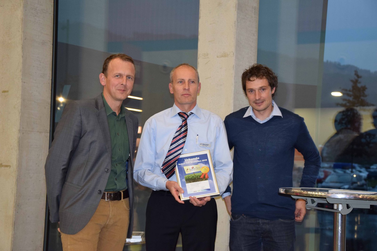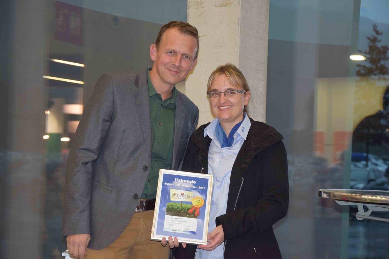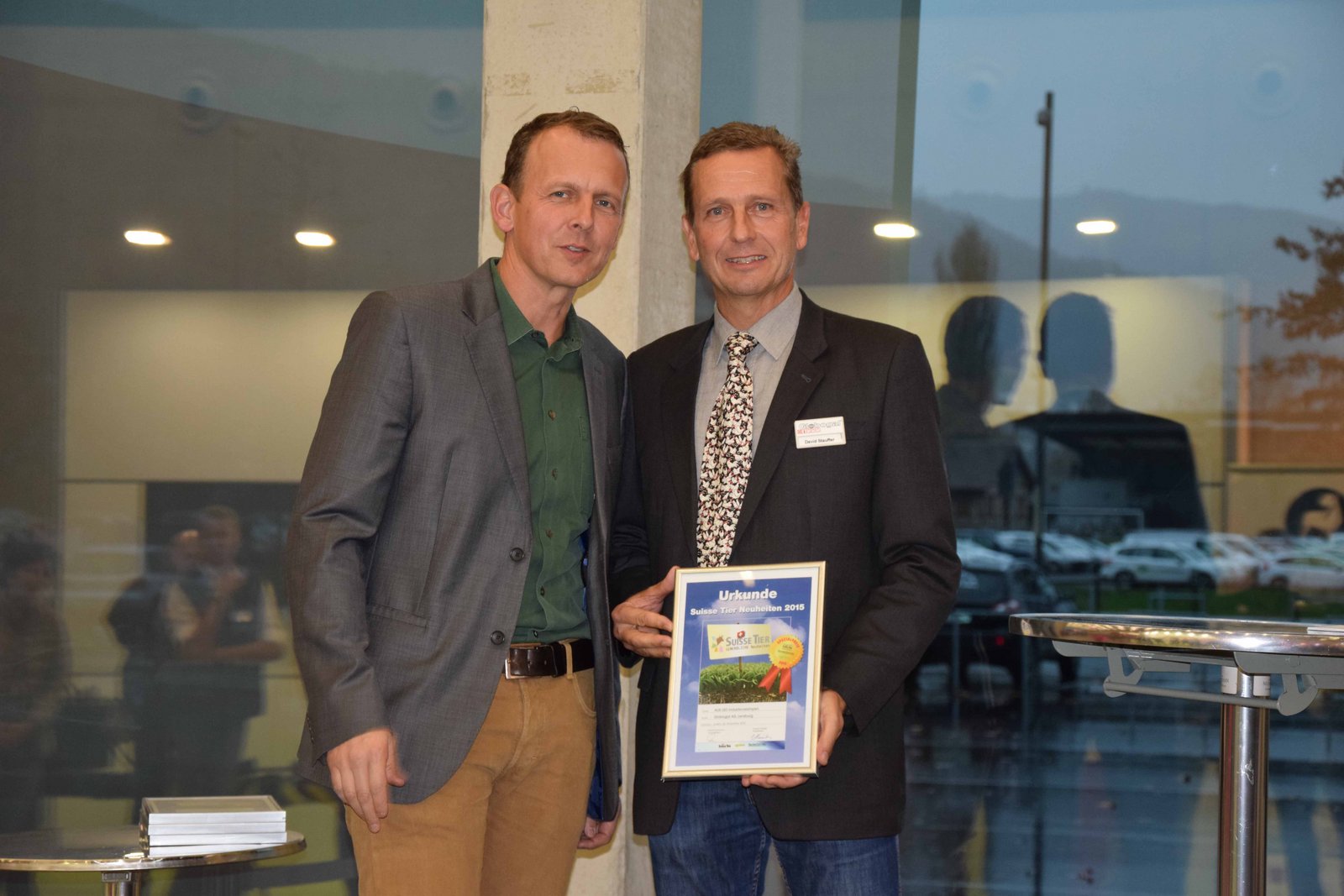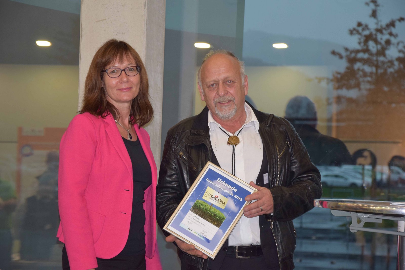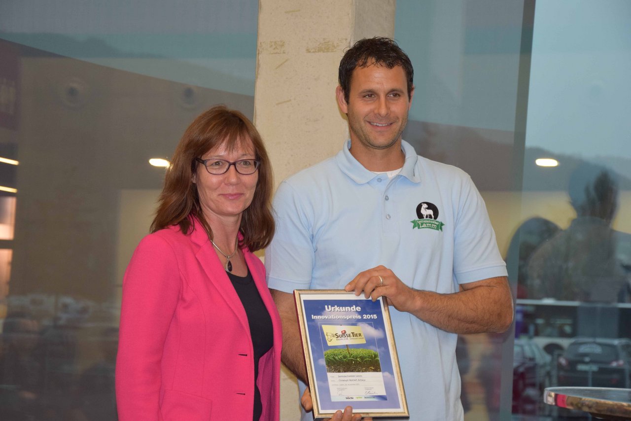Bei der dritten bäuerlichen Innovation handelt es sich um ein Vermarktungsprojekt namens "Zentralschweizer Lamm". Es soll die Vermarktung von Lammfleisch in der Region fördern und so die lokale Wertschöpfung erhöhen. Den Preis entgegen nahmen Ernst Vogel und Geschäftsführer Christoph Bamert.
