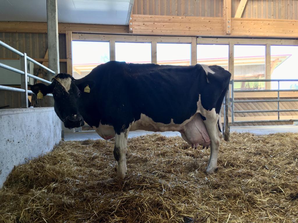 Die fast siebzehnjährige Pauline hat eine beeindruckende Lebensbilanz vorzuweisen: In bisher 12 Laktationen hat sie 188'191 kg Milch gegeben, im Schnitt ganze 31,3 kg pro Tag. Doch die «Superkuh» Pauline produziert nicht nur eine grosse Menge qualitativ sehr guter Milch, sie überzeugt auch mit ihrem Körperbau: Pauline ist linear mit EX-90 beschrieben. Frédéric Bachmanns Vater Albert betont, dass die Kuh sehr gut zu Fuss sei, was ihr besonders beim Gang zum Melkroboter zugutekomme. Von allen Kühen auf dem Hof stelle sich Pauline am liebsten und am häufigsten in den mechanischen Melkstand. Bis zu dreimal täglich lasse sich Pauline melken, was möglicherweise auch einen Einfluss auf die hohe Leistung des Tiers haben könnte, wie die Bachmanns vermuten.