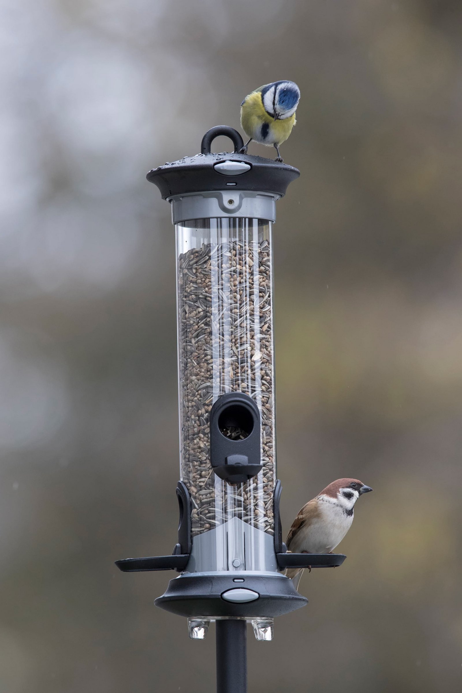 Säulenförmige Futterautomaten eignen sich für körnerfressende Arten wie Finken, Meisen (oben eine Blaumeise), Sperlinge (unten ein Feldsperling) oder Kleiber. (Bild Marcel Burkhardt)