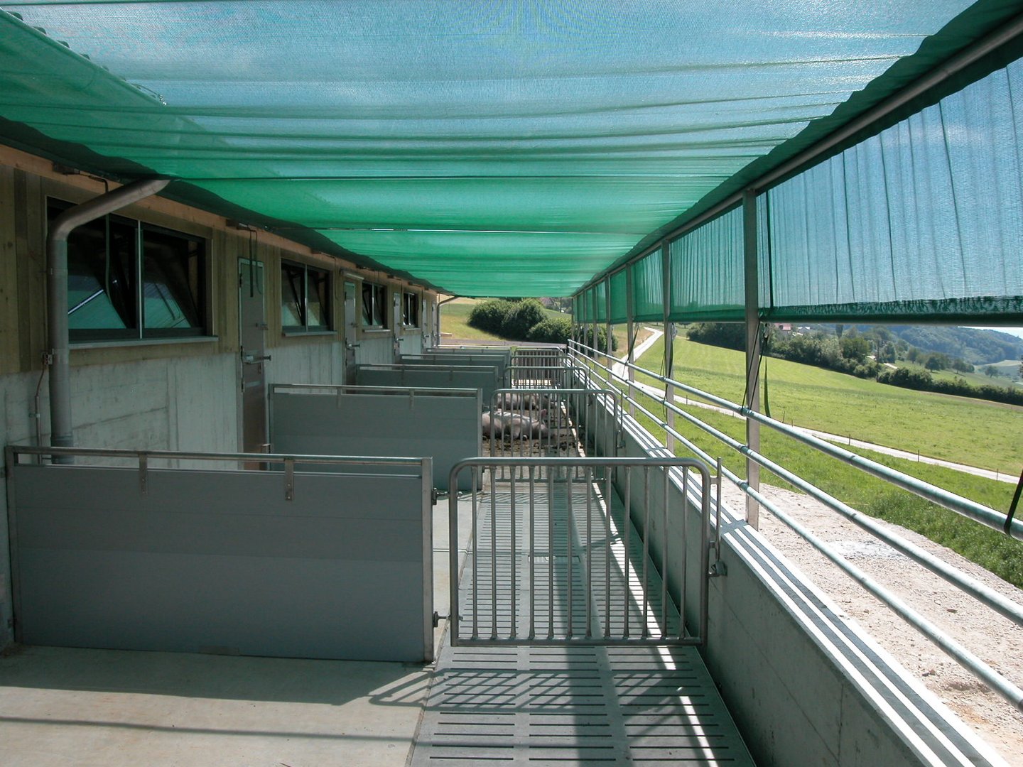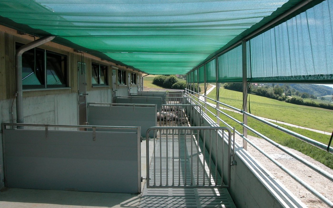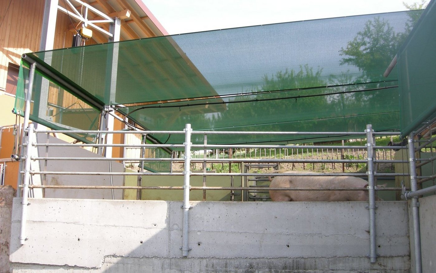 Die Beschattung der Aussenbereiche von Ställen ist besonders bei der Schweinehaltung bekannt - und vor allem wegen der erhöhten Sonnenbrandgefahr wichtig. Dieser Punkt ist auch tierschutzrelevant. Aufgrund der steigenden Intensität der Sommer rückt das Thema Beschattung von Laufhöfen vermehrt auch unter Rinderhaltern ins Zentrum.