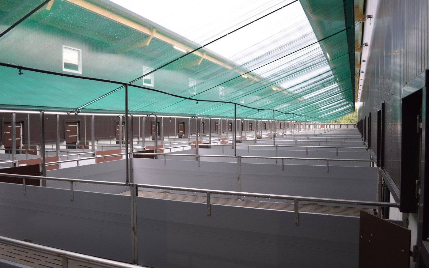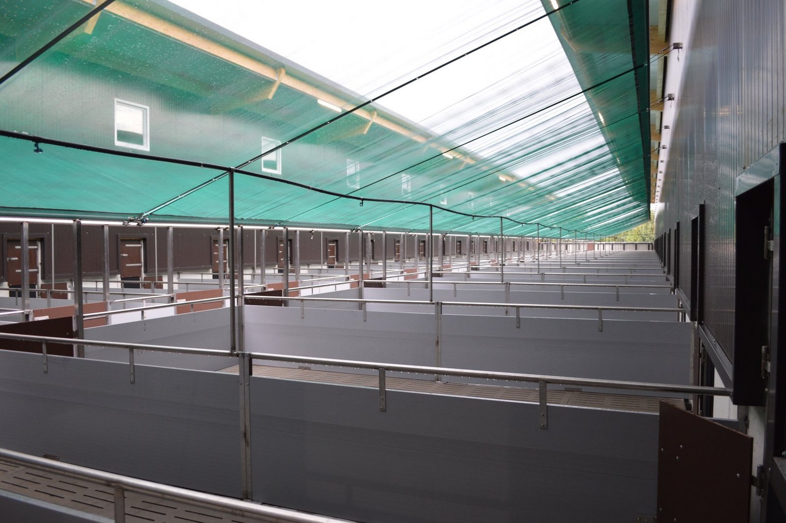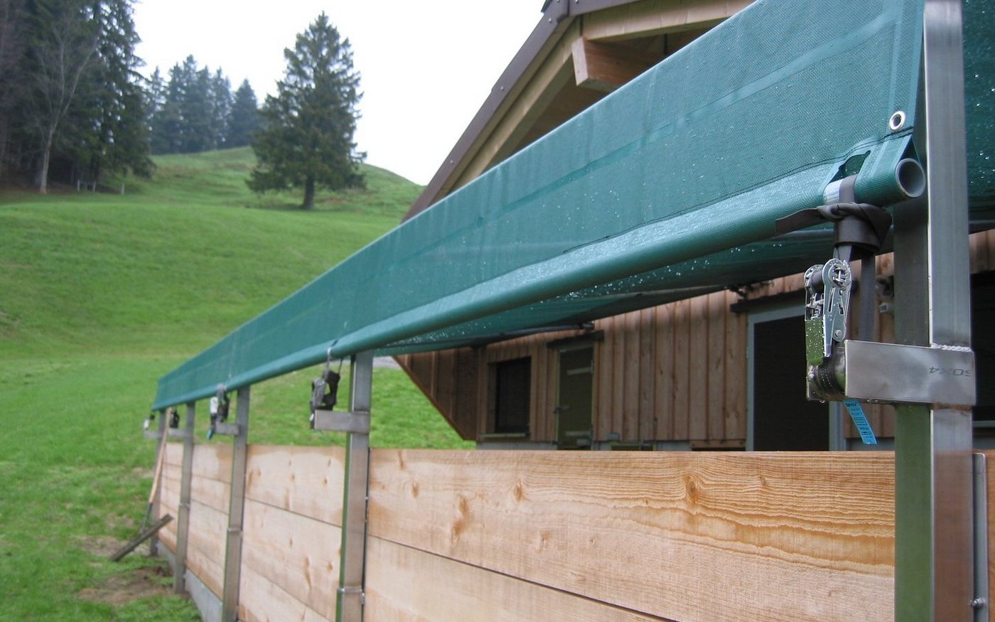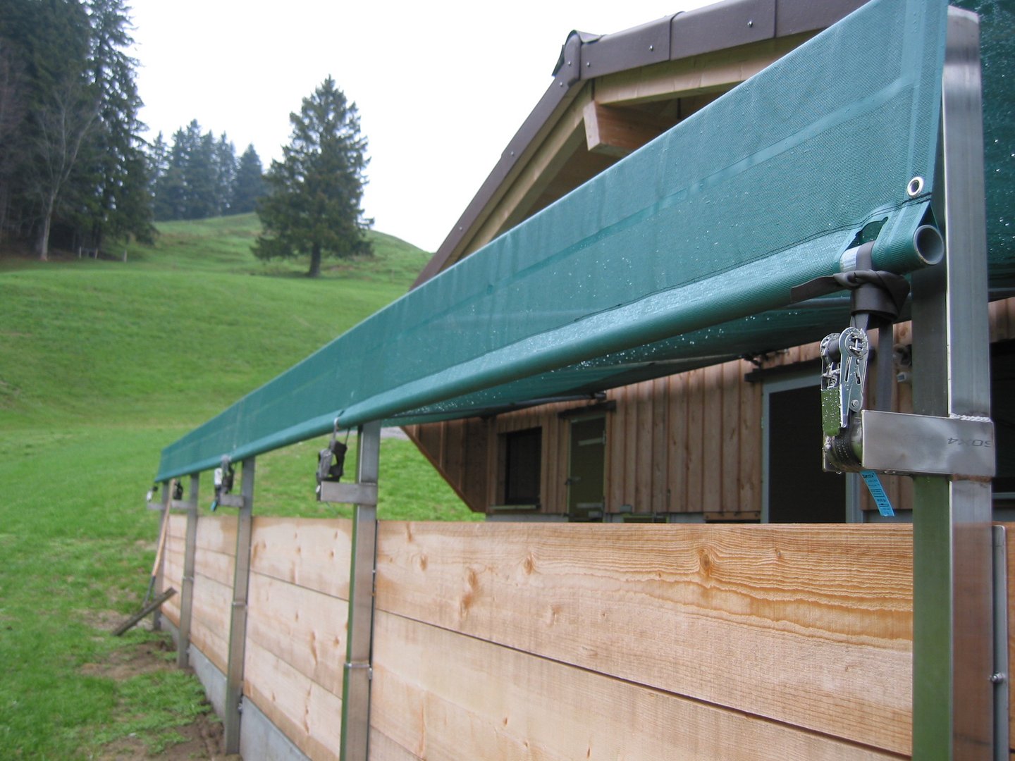 Insbesondere bei nach Südwesten ausgerichteten Ausläufen kann es Sinn machen, die Beschattungsnetze waagrecht über den Tieren und zusätzlich am Ende des Auslaufes auch vertikal einzuplanen. So schützen sie die Tiere auch bei flacher Sonneneinstrahlung. Dafür wird über der Auslaufumrandung ein Rundrohr installiert, und das Beschattungsnetz wird dann über dieses Rohr darüber hinabgezogen.
