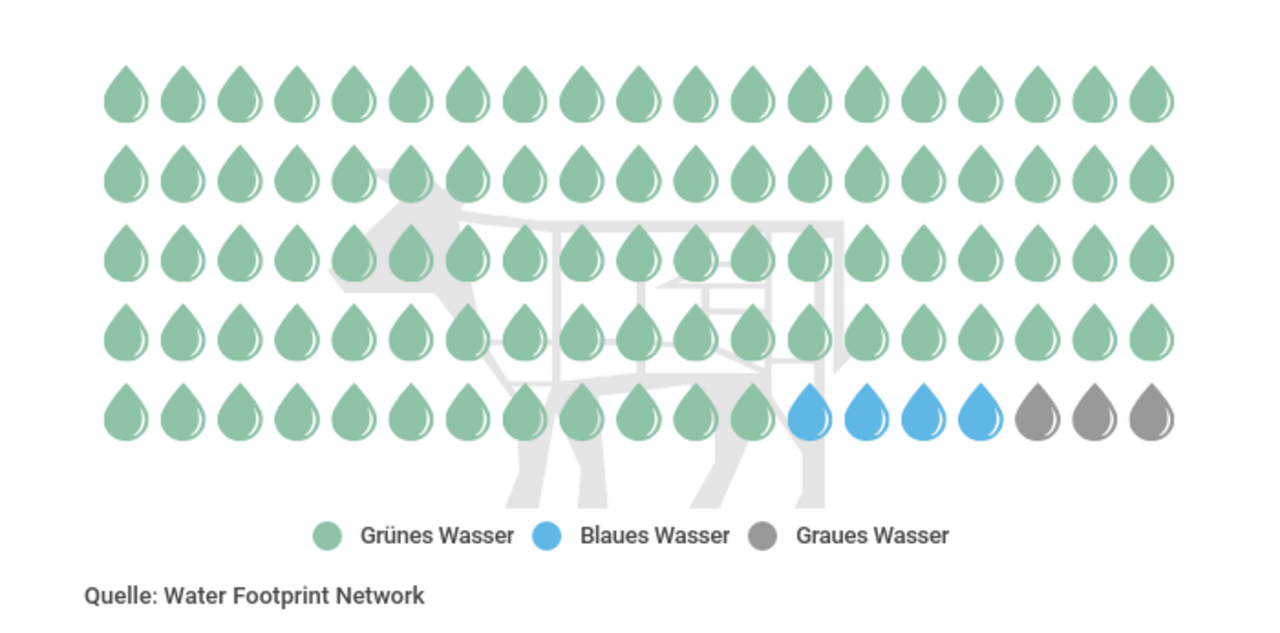 Blickt man auf den Wasserverbrauch für die Produktion von Rindfleisch zeigt sich, dass laut dem Water Footprint Network beim Rindfleisch 94 Prozent grünes, 4 Prozent blaues und 3 Prozent graues Wasser verbraucht wird. Der mit Abstand grösste Anteil wird also dem natürlichen Kreislauf nicht entzogen. Der Regen fiele auch auf die Felder und Weiden, wenn keine Rinder grasten oder kein Futter wüchse. Auch ohne Rindfleisch-Produktion würde auf diesen Flächen Gras wachsen.