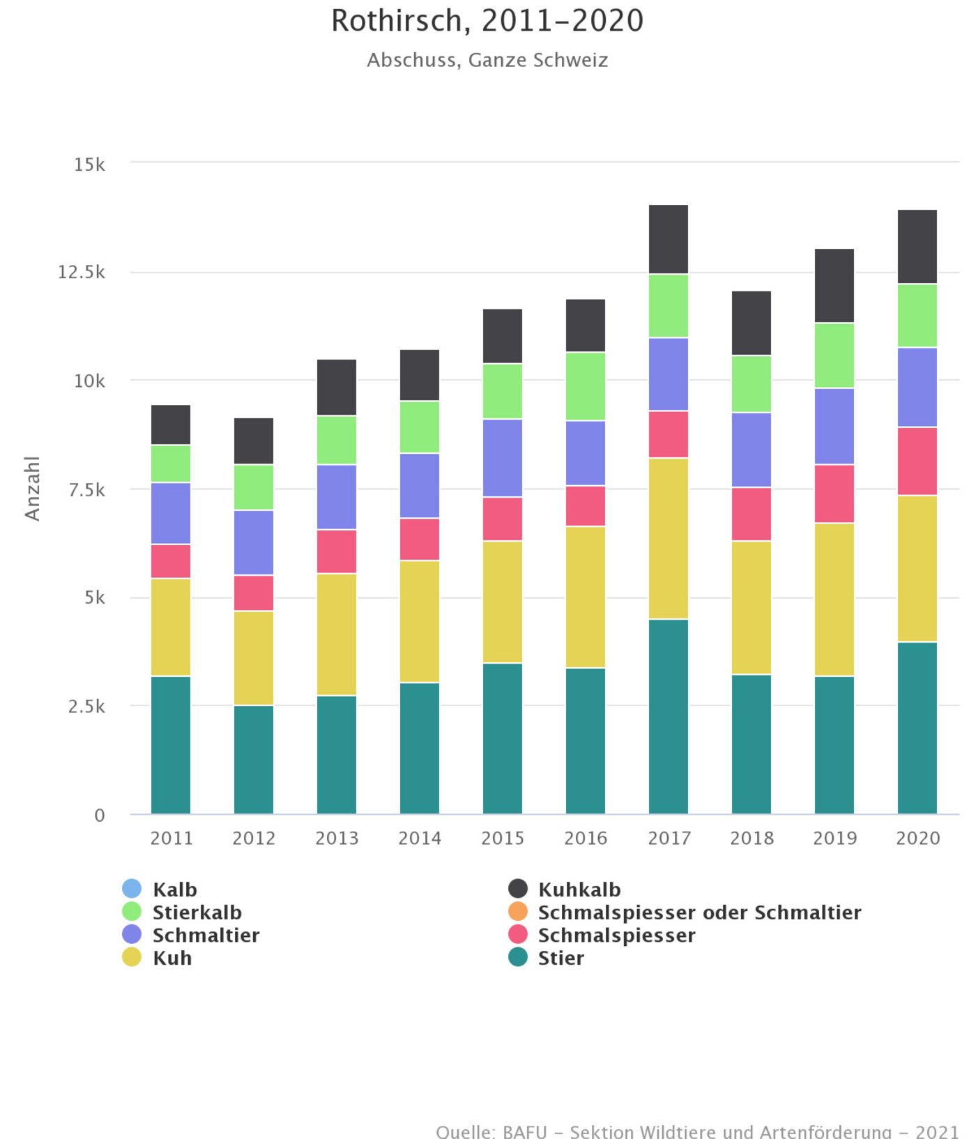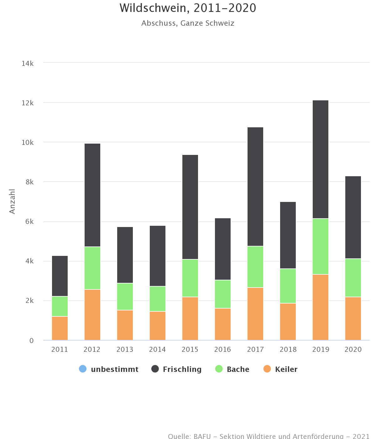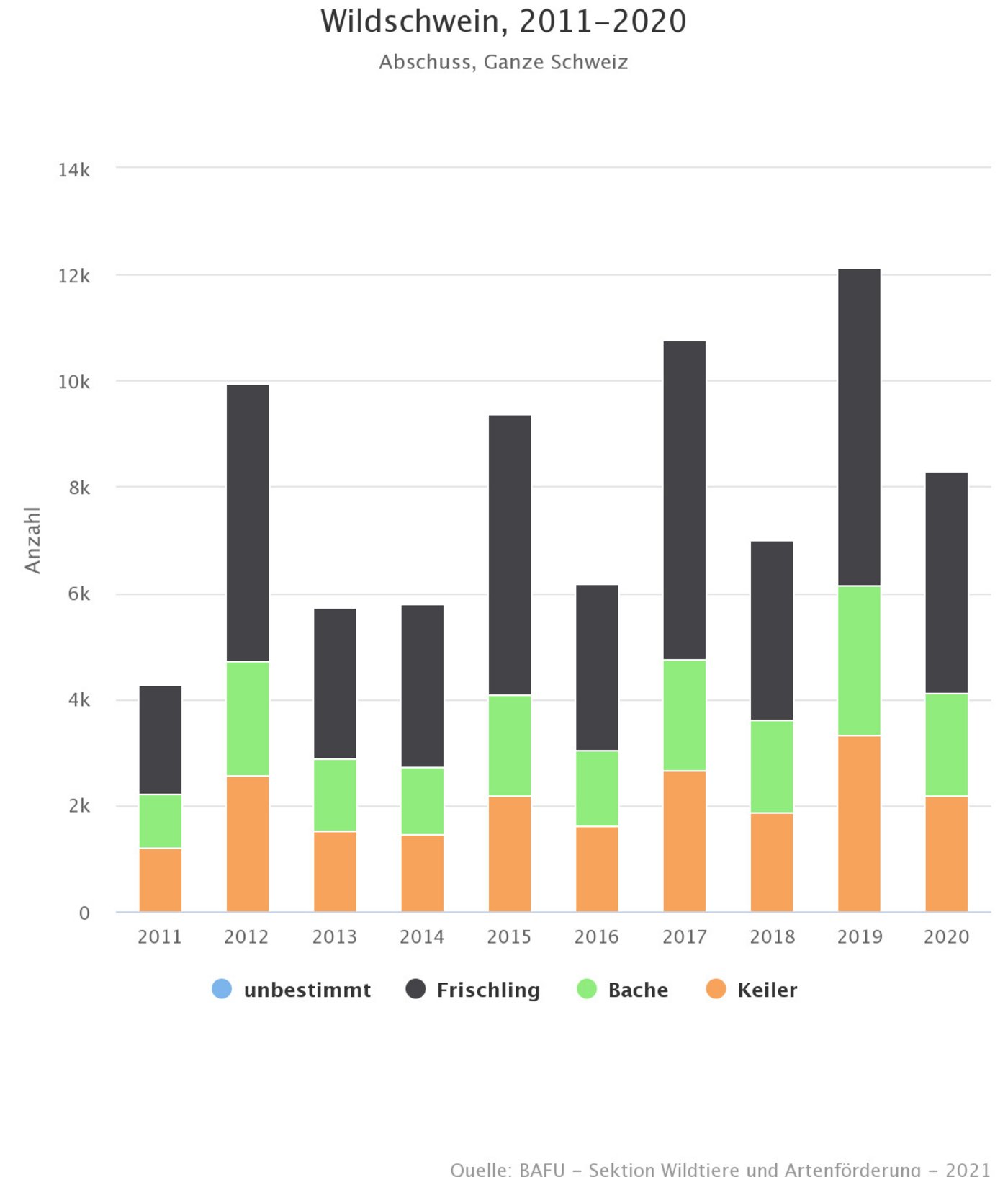 Die Zahl der erlegten Wildschweine stieg im Jagdjahr 2020 auf 8313. Zum Vergleich: 2011 wurden noch 4263 Wildschweine in der Statistik erfasst. Die neuste Jagdstatistik listet zudem 13'935 erlegte Rothirsche auf. 2011 waren es mit 9462 deutlich weniger gewesen.