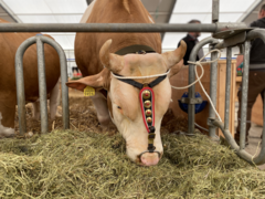 Nach dem Waschen betritt Santos die Halle und geht mit den beiden Emmentalern seelenruhig an seinen Platz. Er schnuppert an seiner neuen Nachbarin, einer Simmentalerkuh. Dann werden die Krippe und deren Inhalt überprüft. Nach einem kurzen Moment beginnt der Muni zu fressen – hier scheint es Santos zu gefallen.