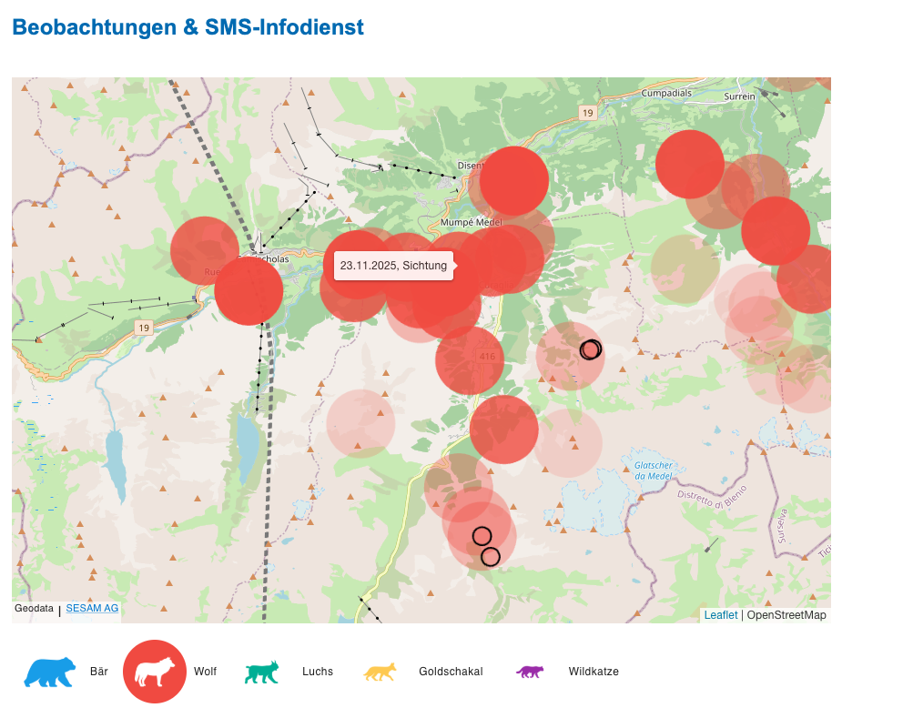 Die Karte des Amts für Jagd und Fischerei Graubünden erzählt eine Geschichte. Rote und rosa Kreise überziehen die Region um Mompé-Medel wie ein dichtes Netz – jede Sichtung, jede Spur, jede Fotofalle des Stagias-Rudels ist dort verzeichnet. Die Wolfspräsenz ist massiv. Und doch fehlen genau dort, wo Pius Manetschs Schafe und Ziegen weiden, die schwarzen Kreise. Sie würden Risse markieren, doch sie sind nicht da.…