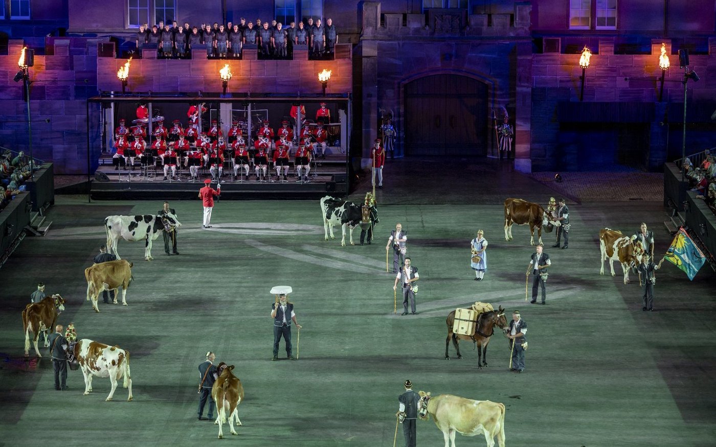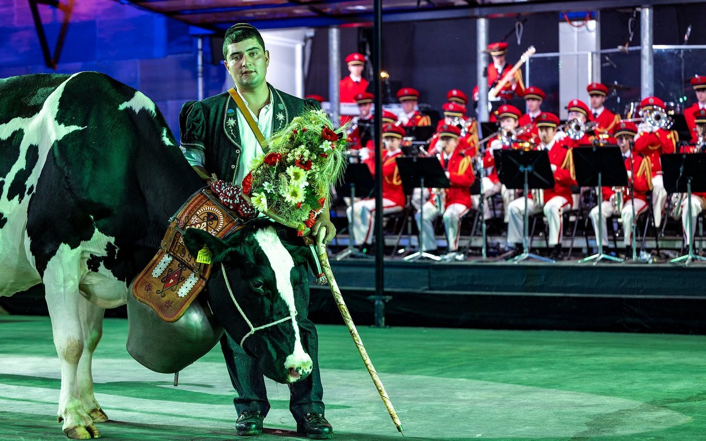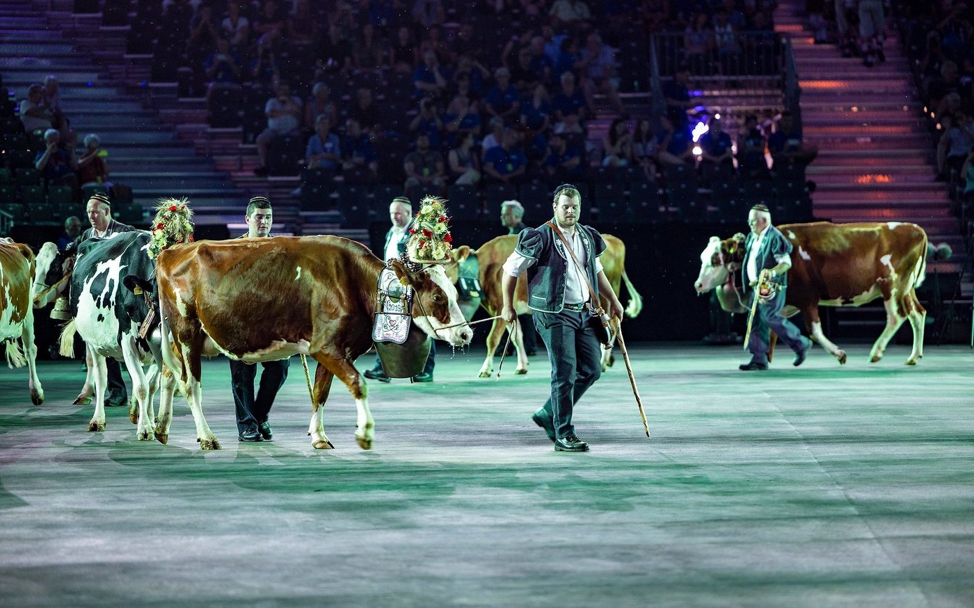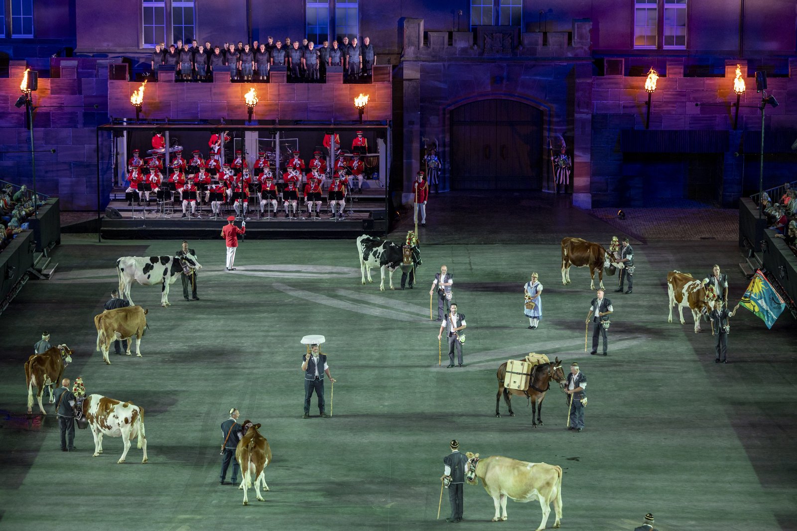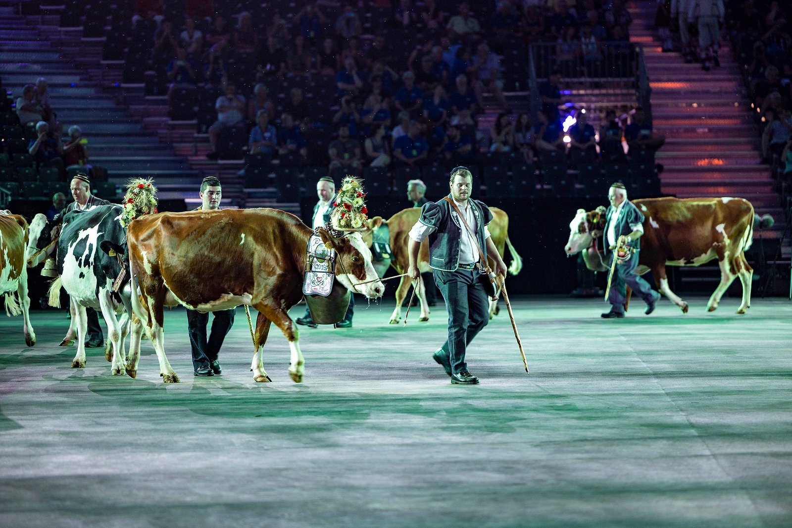 Wer glaubt, dass ein Tattoo nur Dudelsäcke zu bieten hat, geht in die Irre. An der Basel Tattoo Jubiläumsausgabe 2022, die vergangene Woche in der Kaserne Basel über die Bühne ging, trat die «crème de la crème» der internationalen und heimischen Blasmusik auf. Zu sehen waren königliche Garden, rockige Dudelsackklänge und ein Trommelspektakel des Top Secret Drum Corps – und 14 Kühe sowie ein Freiberger.