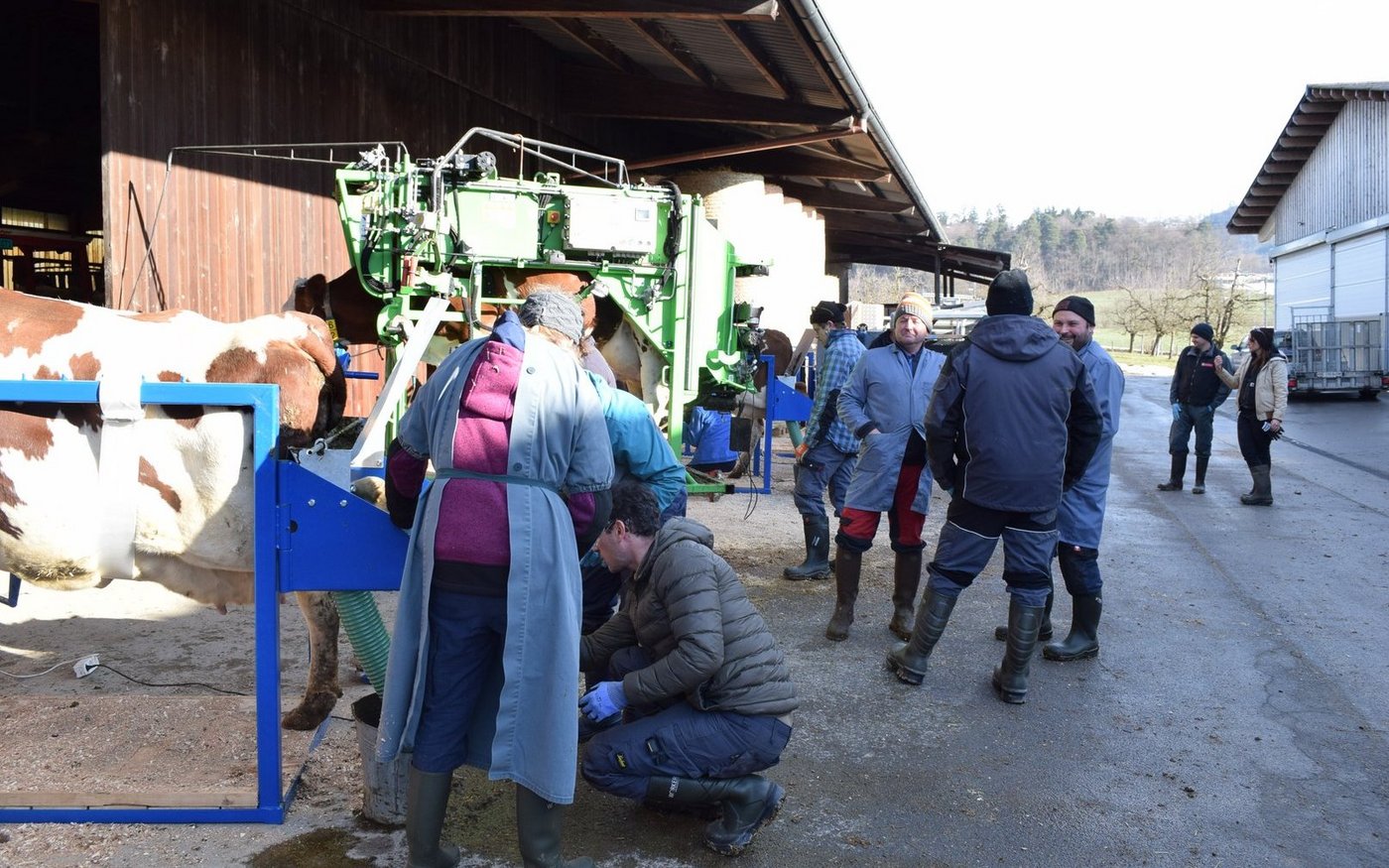 Während die Teilnehmer mit ihren milchblauen Landi-Mänteln auf die nächste Kuh warten, deren Klauen gepflegt werden müssen, durchmengen sich die Generationen auf dem zügigen Hinterhof des Gutsbetriebs.