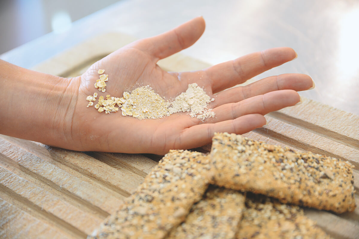 Statt auf herkömmliches Mehl setzt Ramona Marggi bei ihren Low-Carb-Produkten ganz auf Haferkleie. Haferkleiebackwaren haben rund 60 Prozent weniger Kohlenhydrate als vergleichbares Gebäck. Zudem sind sie mit rund 85 Prozent Ballaststoffen besonders sättigend und verdauungsfreundlich. Damit sich Haferkleie zu Teig verarbeiten lässt, muss sie allerdings fein gemahlen werden. Es braucht zudem andere Bindemittel und andere Mengenverhältnisse in den Rezepten.