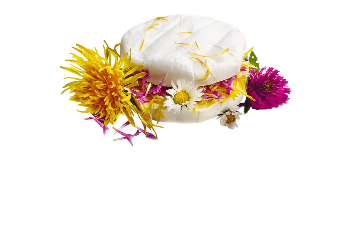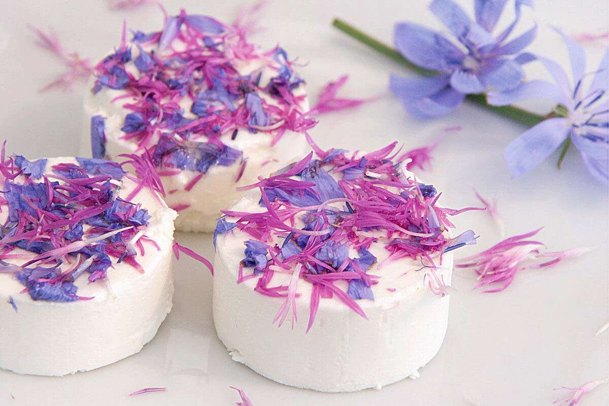 Eine Möglichkeit ist, die frisch gepflückten und abgespülten Blüten einfach auf einen kleinen Frisch- oder Ziegenkäse zu platzieren. Oder einen kleinen Tomme, Camembert oder ein Stück Brie horizontal in der Mitte durchschneiden. Zwei bis drei Handvoll Blütenblätter, etwas Pfeffer und Fleur de Sel auf die untere Hälfte geben.