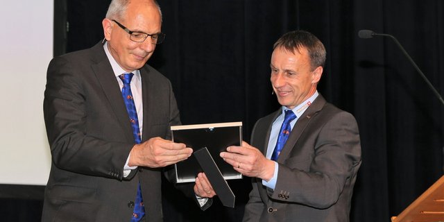 Pius Meier gratuliert seinem Nachfolger Reto Enz (rechts) zum Präsidentenamt des Zuger Tierzuchtverbandes.