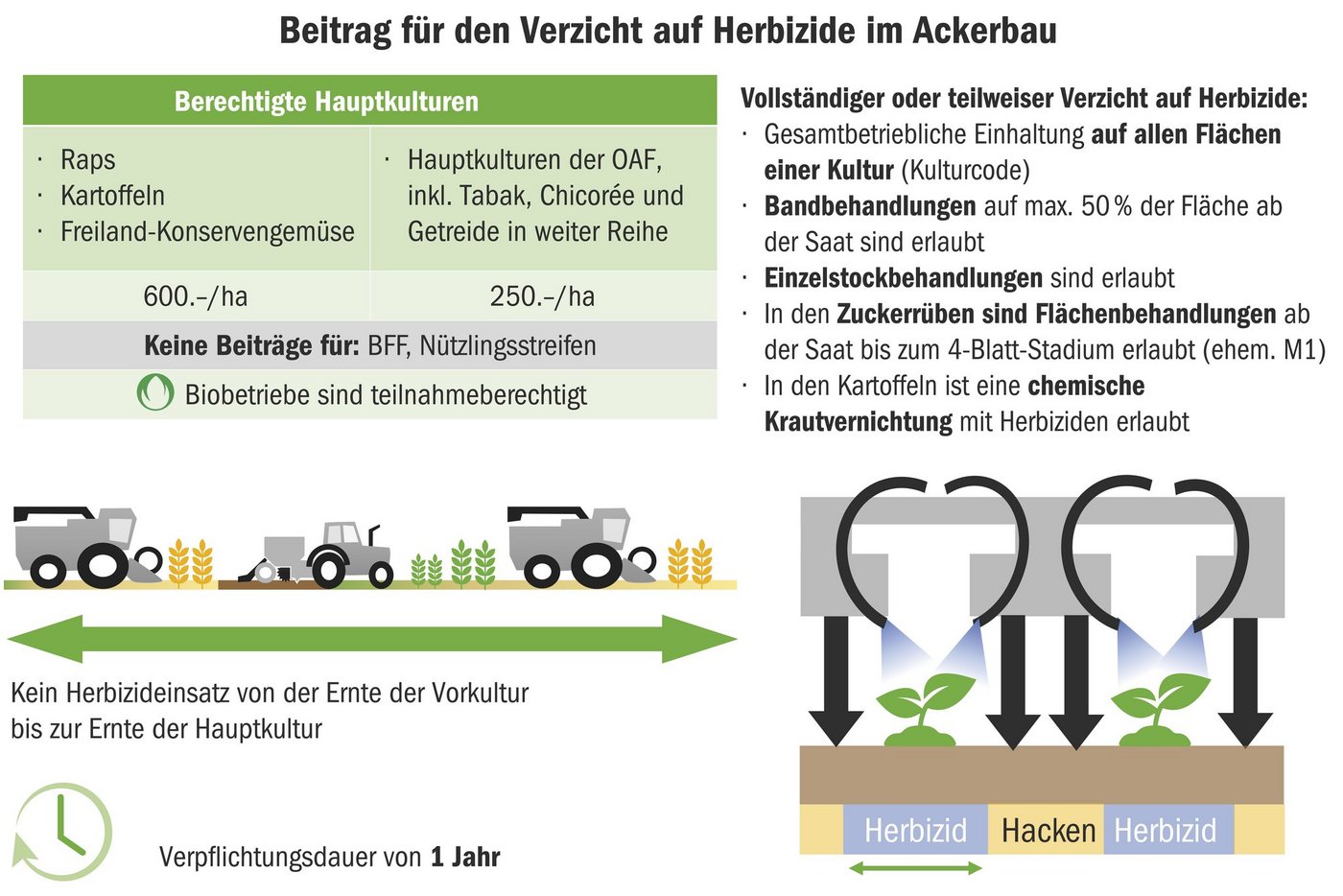 Dossier Agrarpolitik Absenkpfad Pflanzenschutzmittel und Nährstoffe Montag, 5. September 2022 Das Ziel des Produktionssystembeitrags «Verzicht auf Herbizide» ist es, den Einsatz von chemischen Unkrautbekämpfungsmitteln zu reduzieren. Herbizide sollen durch mechanische Unkrautbekämpfungsmethoden wie Striegeln und Hacken oder andere agronomische Lösungen wie beispielsweise Untersaaten ersetzt werden. Ab 2023 werden alle vom Bund unterstützten Massnahmen zur Reduktion von Herbiziden unter dem Beitrag «Verzicht auf Herbizide» zusammengefasst. Im Ackerbau ersetzt dieser neue Beitrag die bisherigen Ressourceneffizienzbeiträge «Reduktion von Herbiziden auf der offenen Ackerfläche» und «Reduktion von Pflanzenschutzmitteln im Zuckerrübenanbau».