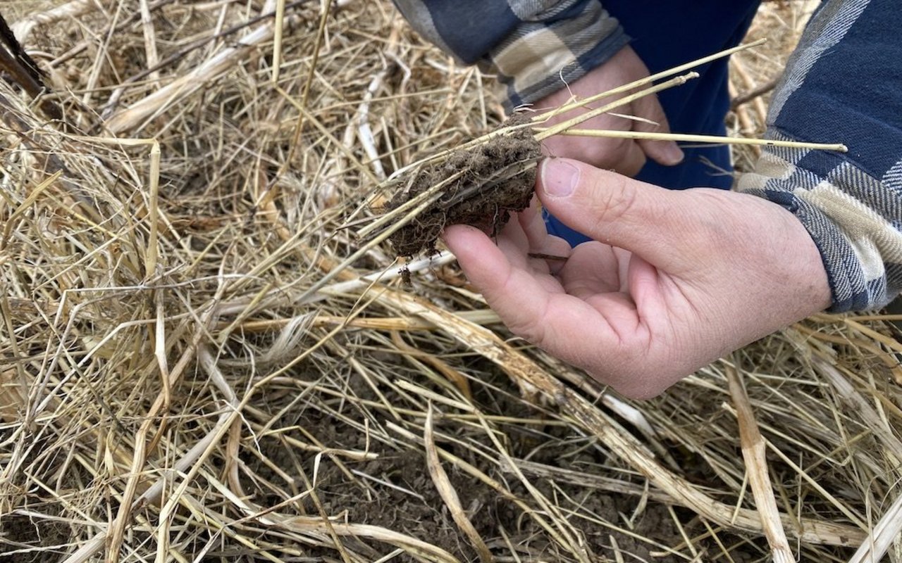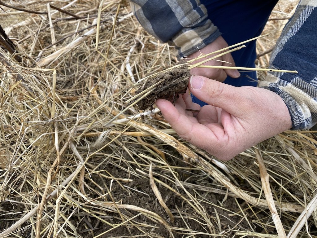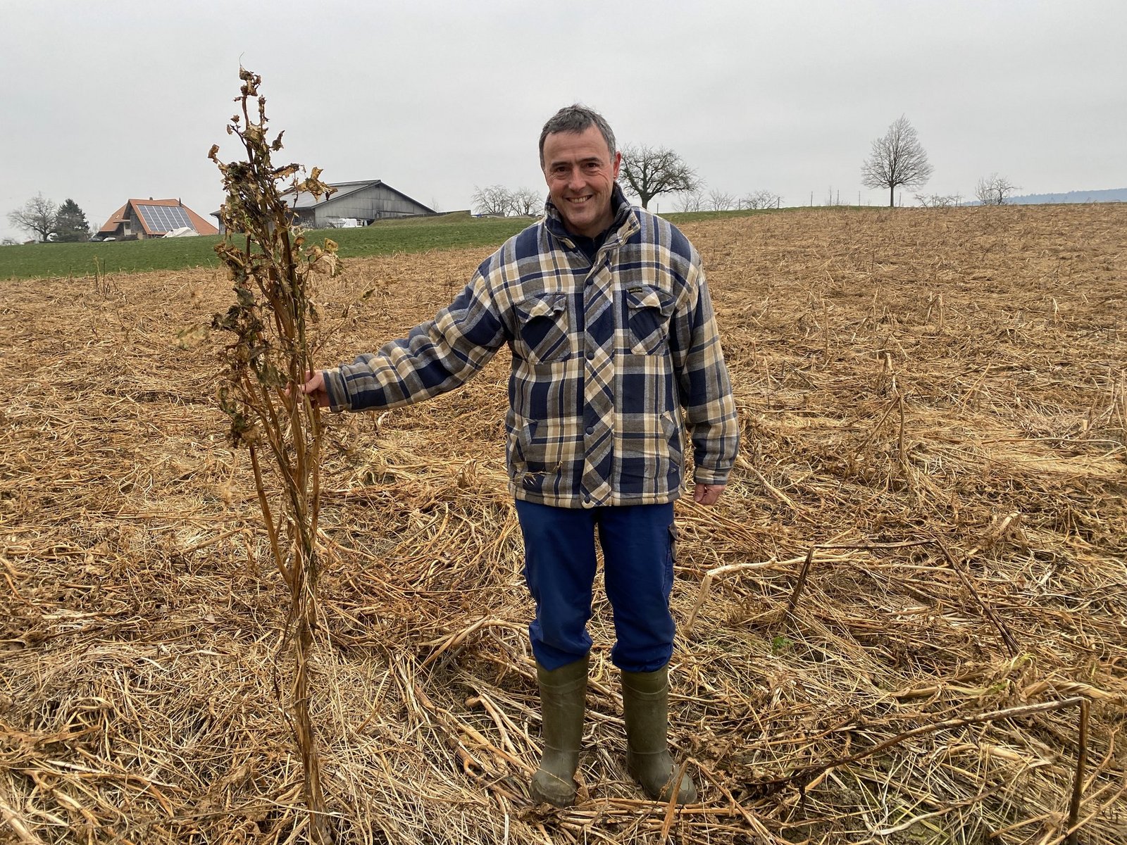 Beherzt zerrt Jürg Lauper die dicken, trockenen Stängel des abgestorbenen Rettichs zur Seite. Der Boden, der darunter zum Vorschein kommt, ist krümelig und mit Wurmgängen durchsetzt. Nur vereinzelt spriesst zartes Unkraut, dass der Landwirt kritisch beäugt. «Diese Gründüngung habe ich gleich nach dem Strohräumen der Wintergerste gesät», erklärt er. Mit der Unkrautunterdrückung ist er ziemlich zufrieden. Im unteren Teil habe er Glyphosat eingesetzt, doch es ist kein Unterschied zum Rest des Feldes sichtbar. «Offenbar geht es in diesem Fall auch ohne», schlussfolgert Lauper. Ausprobieren gehört für ihn dazu – auch wenn seine Fruchtfolge sorgfältig geplant ist und er schon seit 1998 seine Flächen direktsät.
