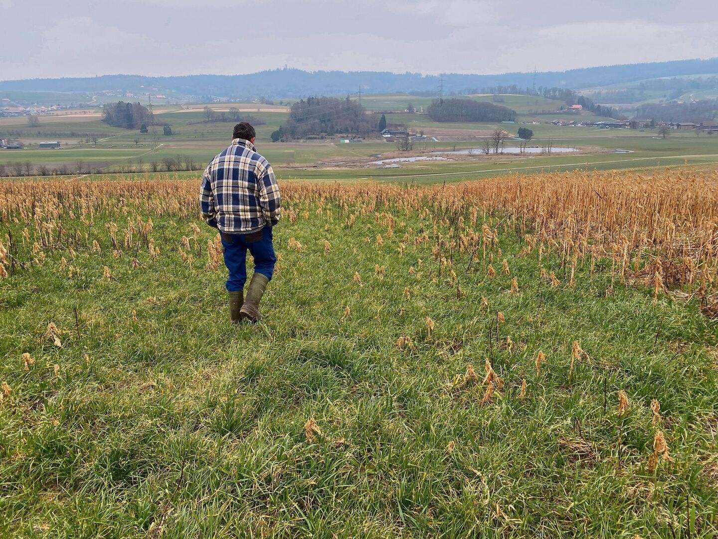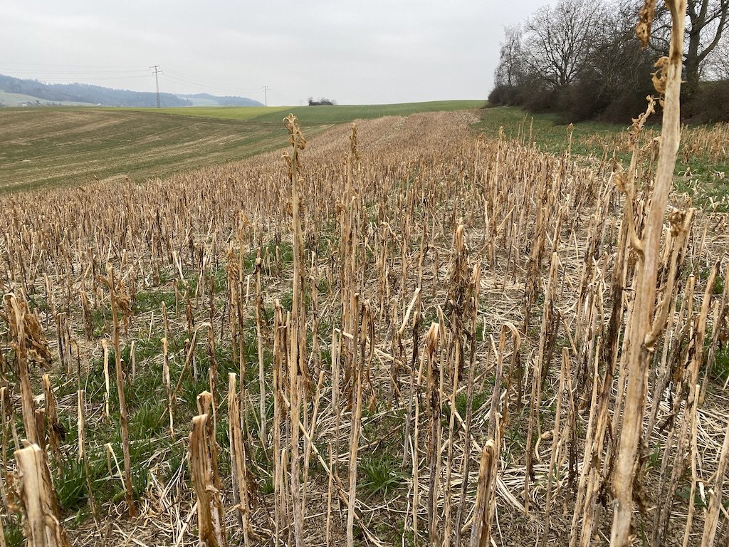 Die GD vor dem Mais sollte den Winter überstehen, um den Boden bis zur Maissaat zu schützen. Zu diesem Zweck hat der Berner letztes Jahr eine Mischung aus abfrierenden und überwinternden Pflanzen gesät, letztere hätten sich aber vor dem Winter zu wenig entwickeln können. So stehen nun auf dem Feld zwar hohe aufrechte Stiele der abgefrorenen Arten, der frostharte Roggen konnte sich aber nicht ausreichend etablieren.