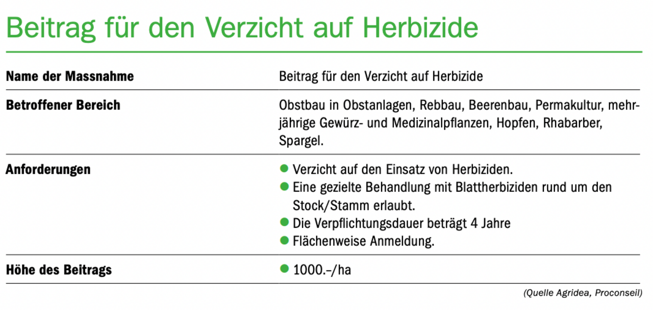 Parallel zu den Änderungen für die einjährigen Spezialkulturen und den Rebbau gibt es mit der neuen Agrarpolitik auch Anpassungen beim Obstbau. Diese Änderungen umfassen strengere Anforderungen an den ökologischen Leistungsnachweis sowie freiwillige Massnahmen. Eine dieser Neuerungen ist die Reduktion der Abdrift und Abschwemmung um mindestens einen Punkt. Die Reduktion der Abschwemmung muss auf allen Parzellen eingehalten werden, die mehr als 2 % Neigung aufweisen und in Richtung Gefälle an Oberflächengewässer und entwässerte Strassen oder Wege angrenzen. Dies wird durch die begrünten Fahrgassen und Vorgewende bereits erfüllt.