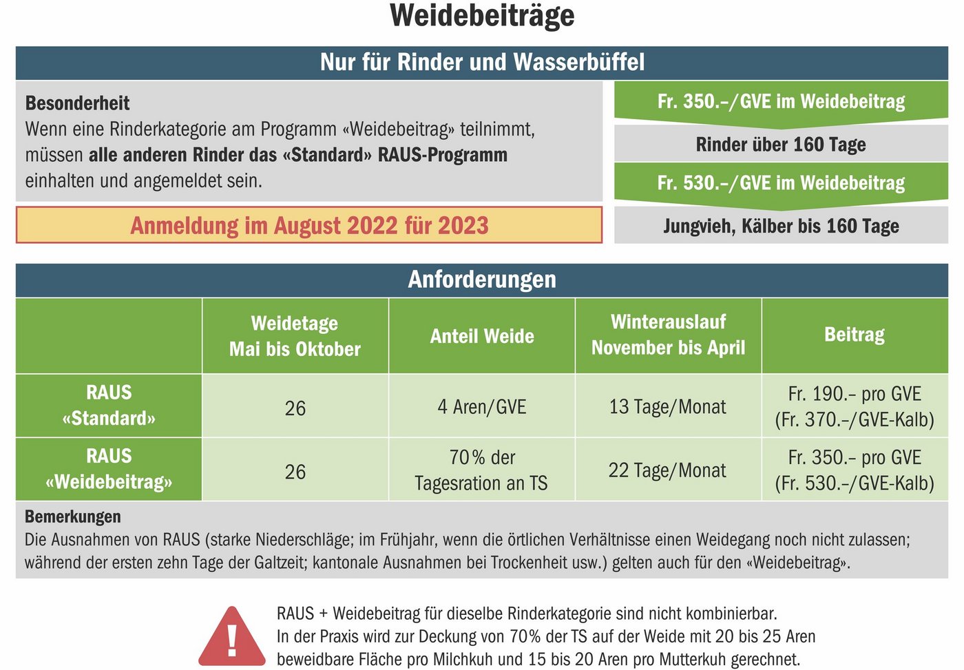 Der Beitrag für Weidegang ist nur für Rindvieh und Wasserbüffel bestimmt. Pferde, kleine Wiederkäuer, Schweine, Geflügel, Hirsche und Bisons können nicht angemeldet werden. Bei der Teilnahme am Programm zum «Weidebeitrag» für eine Rinderkategorie müssen alle anderen Rinderkategorien des Betriebs mindestens die Anforderungen des Standard-RAUS erfüllen. [IMG 2] Beide Stufen nicht kumulierbar Jeder Landwirt kann…