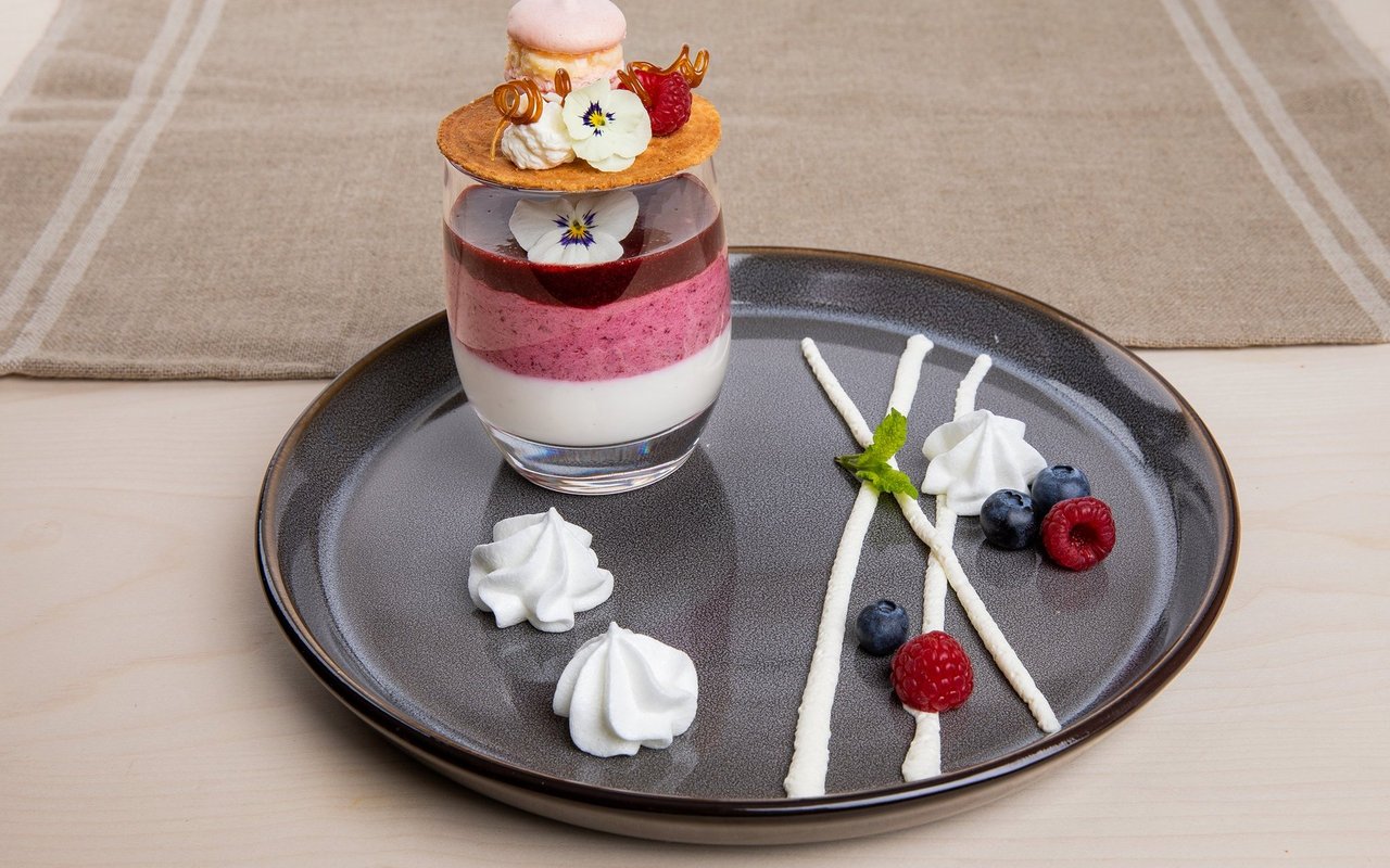 Das Dessertglas aus dem Kühlschrank nehmen und auf Dessertteller stellen. Das Glas mit einem Bretzeli belegen. ein Macaron darauf anrichten und mit Meringues, Ricola-Spirale und Beeren ausgarnieren. Den Teller mit Schlagrahm, Meringues, Beeren (Himbeeren, Johannisbeeren und Heidelbeeren) und Stiefmütterchen ausgarnieren.