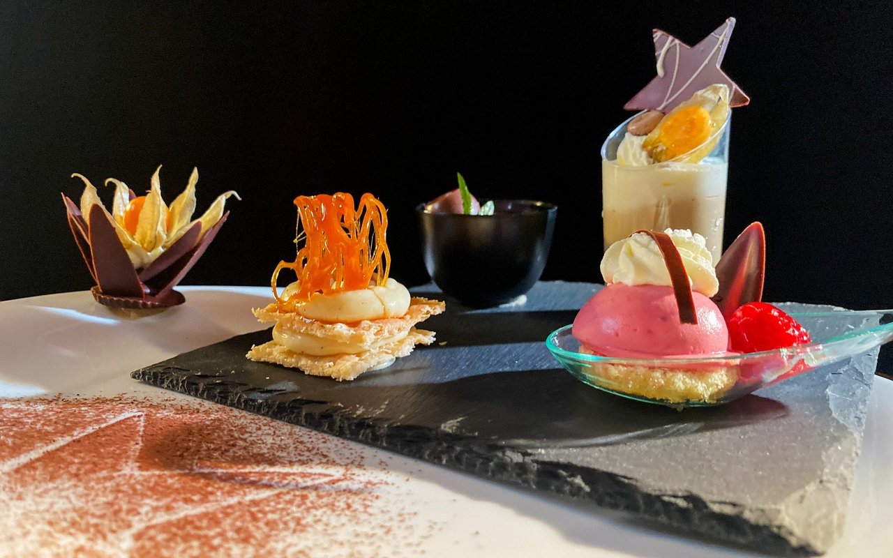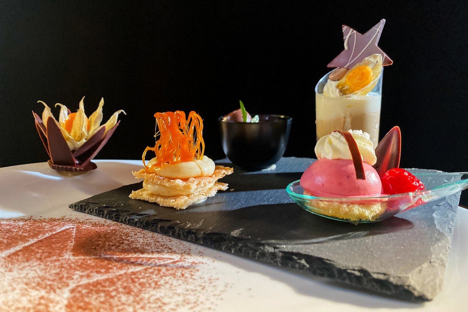Himbeermousse, Macchiato-Torte, Traubencrème und gefüllte Blätterteigblätter auf dem Dessertteller anrichten oder zusätzlich auf einer Platte anrichten und auf den Dessertteller stellen. Den Dessertteller mit einer Schokoladeblumen, gefüllt mit einer Physalis dekorieren.