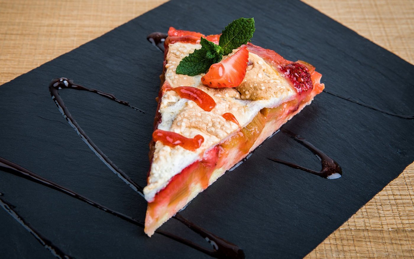- Rhabarber-Würfel auf den Mürbeteigboden verteilen. Erdbeer-Viertel darauf auslegen.