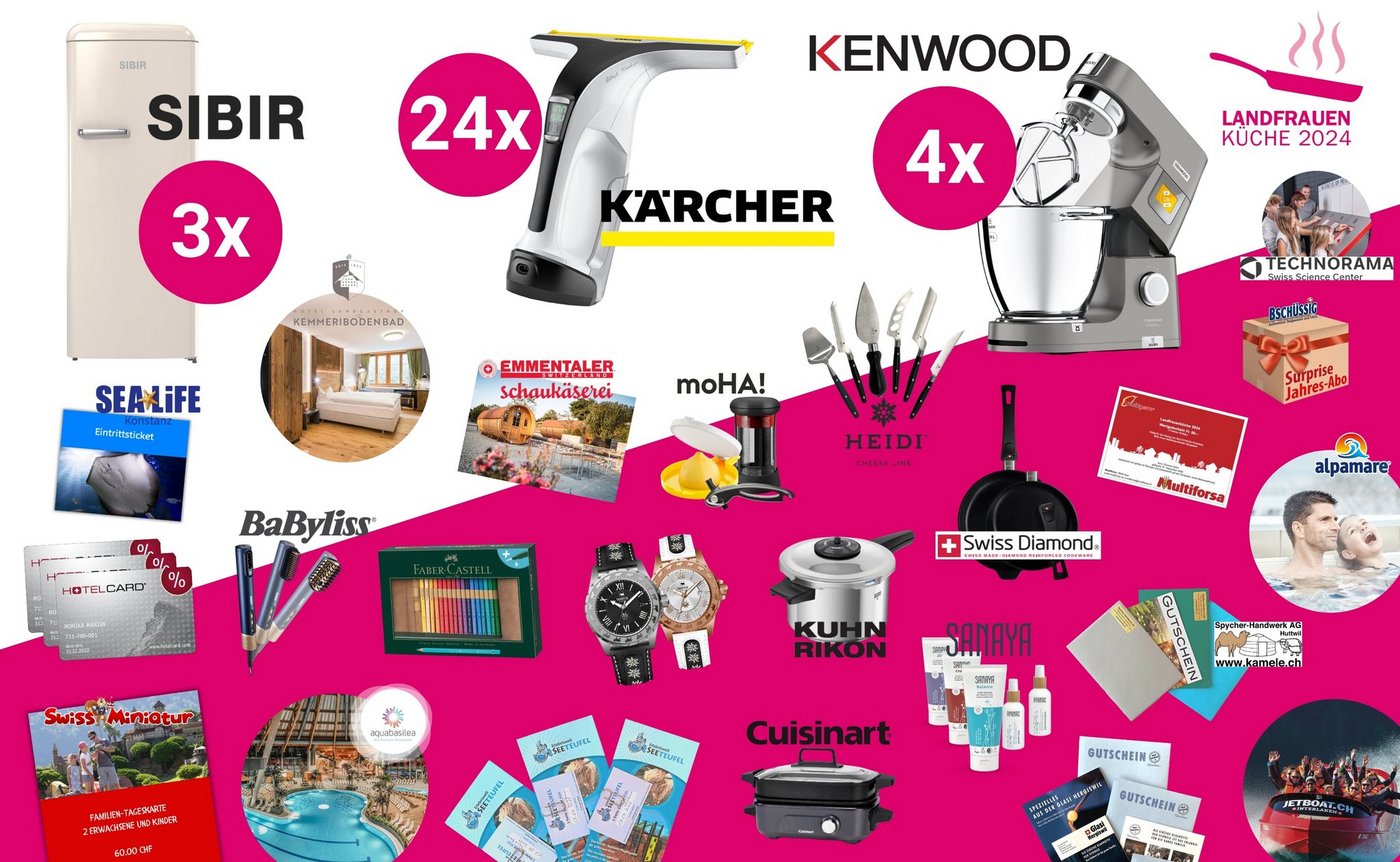 Jede Woche stellen wir Ihnen eine Quizfrage zu den Kandidatinnen und verlosen tolle Preise im Gesamtwert von über 17’000 Franken, darunter 3x einen Retrokühlschrank von Sibir, 24x einen Akku-Fensterreiniger von Kärcher, 4x einen Titanium Chef Patissier XL von Kenwood und Vieles mehr.