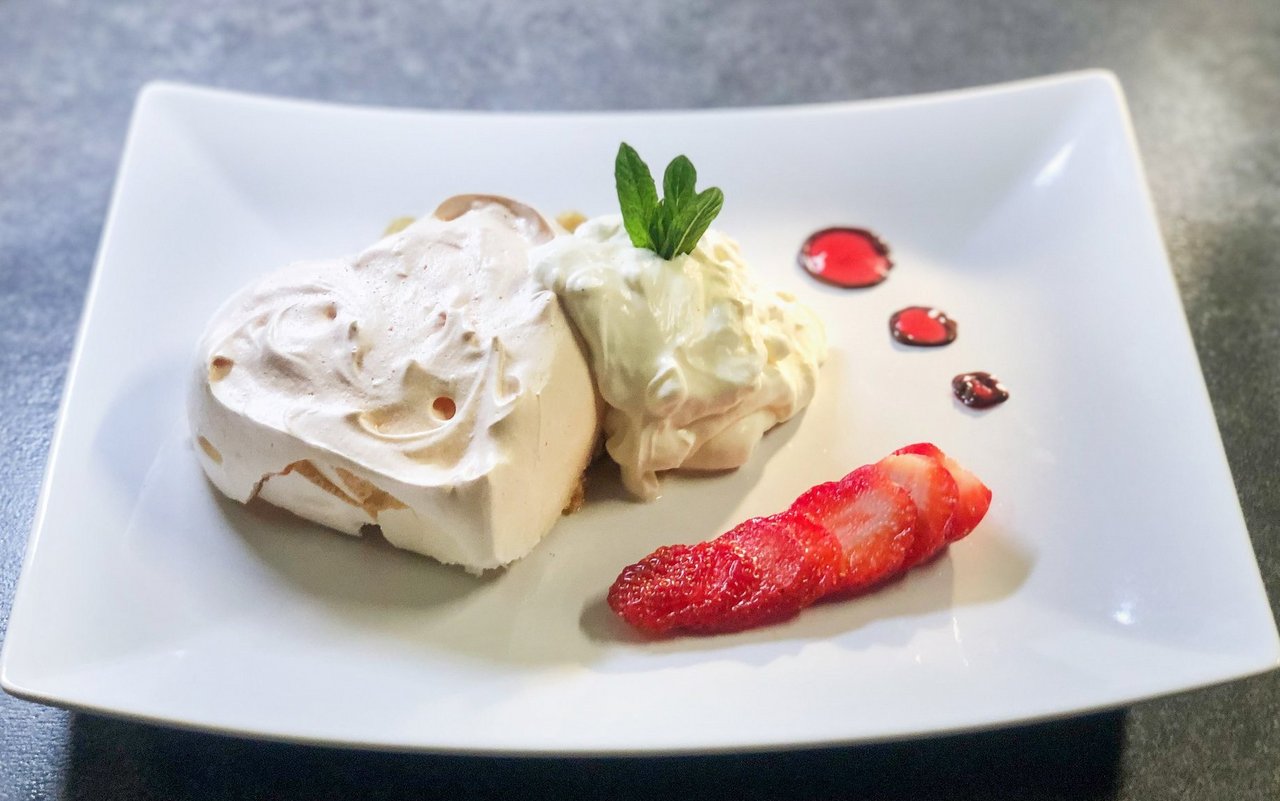 Mit dem Rhabarberkompott auf Dessertteller einen Kompott-Spiegel bilden. Je eine Pavlova-Herz darauf anrichten. Rahmmischung daneben dressieren. Mit Pfefferminzblättchen ausgarnieren.