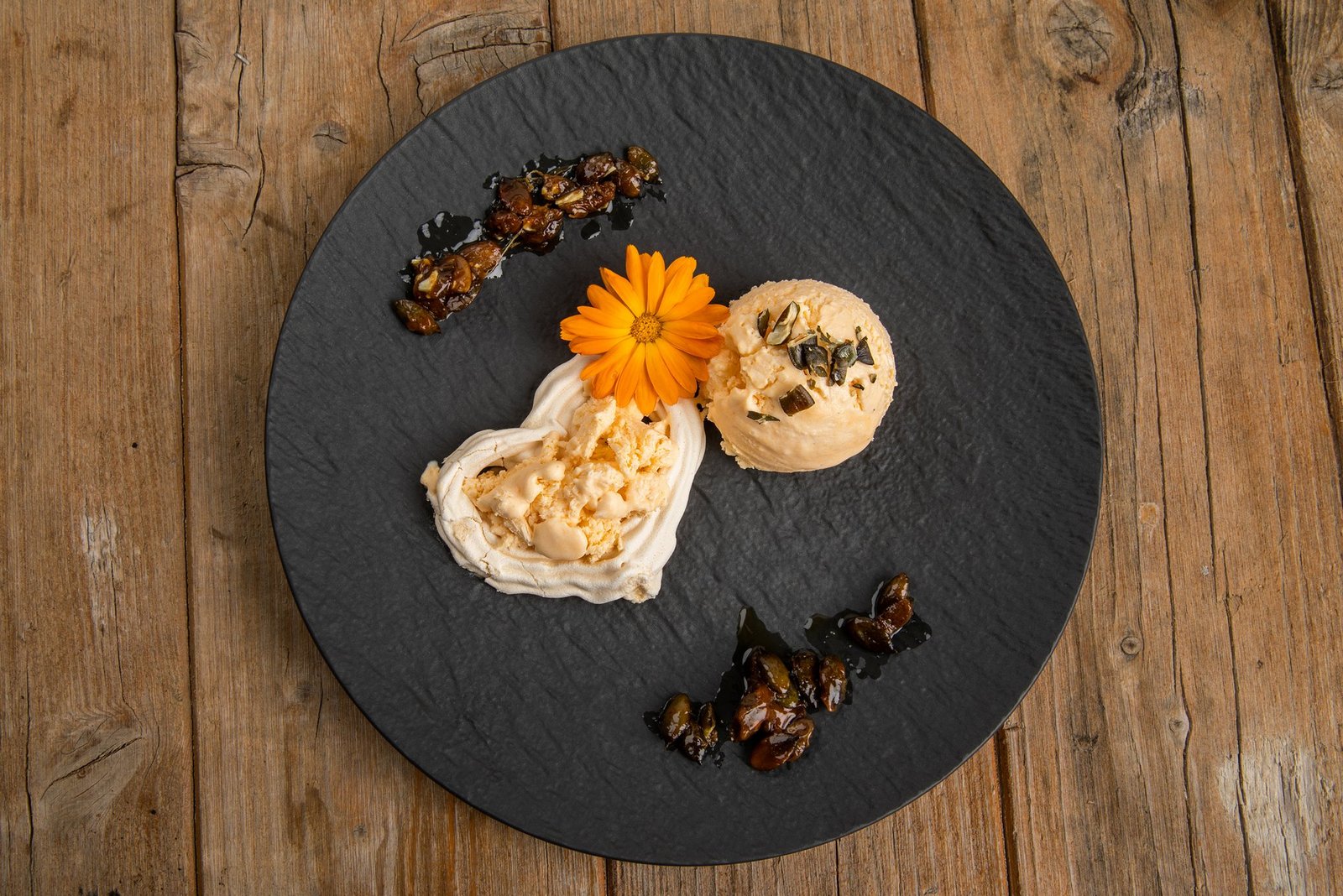 Vom Kürbisglace Kugeln abstechen, auf Dessertteller platzieren und mit  Kürbiskernen bestreuen. Einen Tupfer Rahm daneben platzieren und mit Meringues belegen. Mit Tannenhonig verzieren.