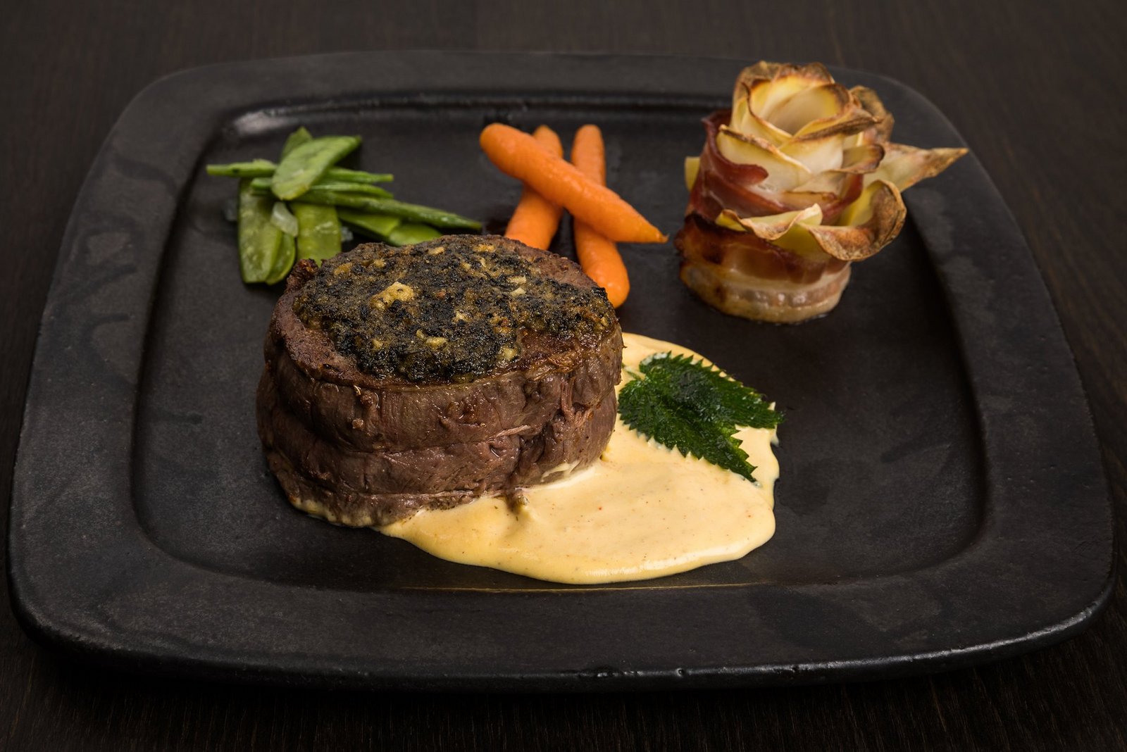 Auf vorgewärmten Tellern mit der Sauce einen Saucenspiegel bilden. Rindsmedaillon darauf anrichten. Kartoffelrosen aus der Form nehmen und neben das Fleisch legen. Kefen und Karotten daneben anrichten. Brennnesselblätter neben das Fleisch auf die Sauce legen. Mit geschnittenem Schnittlauch bestreuen.