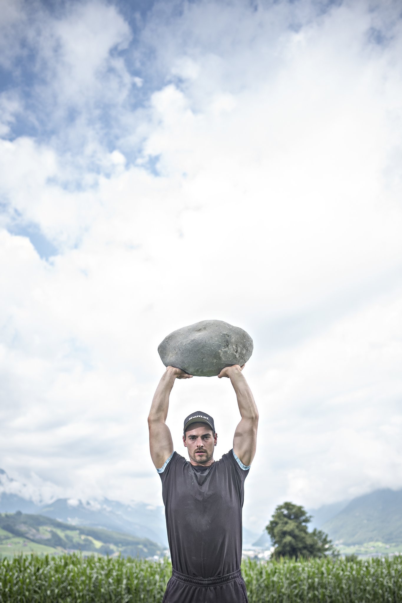 Dann läuft der 28-Jährige los und balanciert den weit über 80 Kilo schweren Brocken über seinem Kopf dem Balken entgegen, den er am hinteren Ende des Hofes in den Boden eingelassen hat. Die Erschütterung beim Einschlag des Steines lässt das Rindvieh auf der nahen Weide kollektiv zusammenzucken. Schuler spannt das Messband – «ja, es geht in die richtige Richtung».