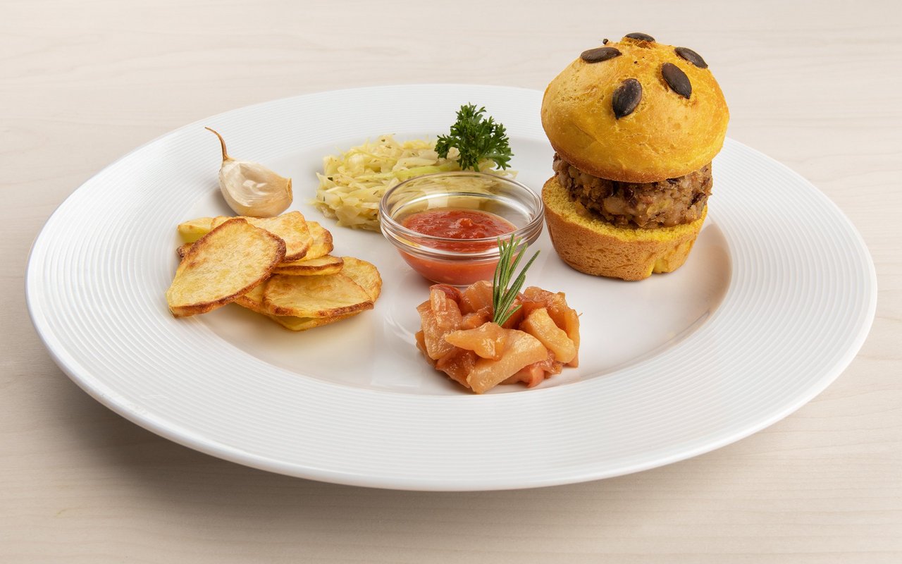 Chürbisweggli mit einem Brotmesser quer aufschneiden und mit der Schnittfläche nach oben kurz im Backofen aufwärmen, mit Bohnen-Burger füllen und auf dem Teller anrichten. Den «Chürbisweggli»-Deckel schräg darauf anrichten. Gläsli mit Ketchup dazustellen. Die runde Ausstechform (8 cm) rechts und links davon hinhalten und mit je 2-3 EL Apfel-Rosmarin-Tröimli und Kabisgheu füllen. Kartoffelchips zusammen mit einer Knoblauchzehe darauflegen. Mit Rosmarin und Petersilie ausgarnieren.
