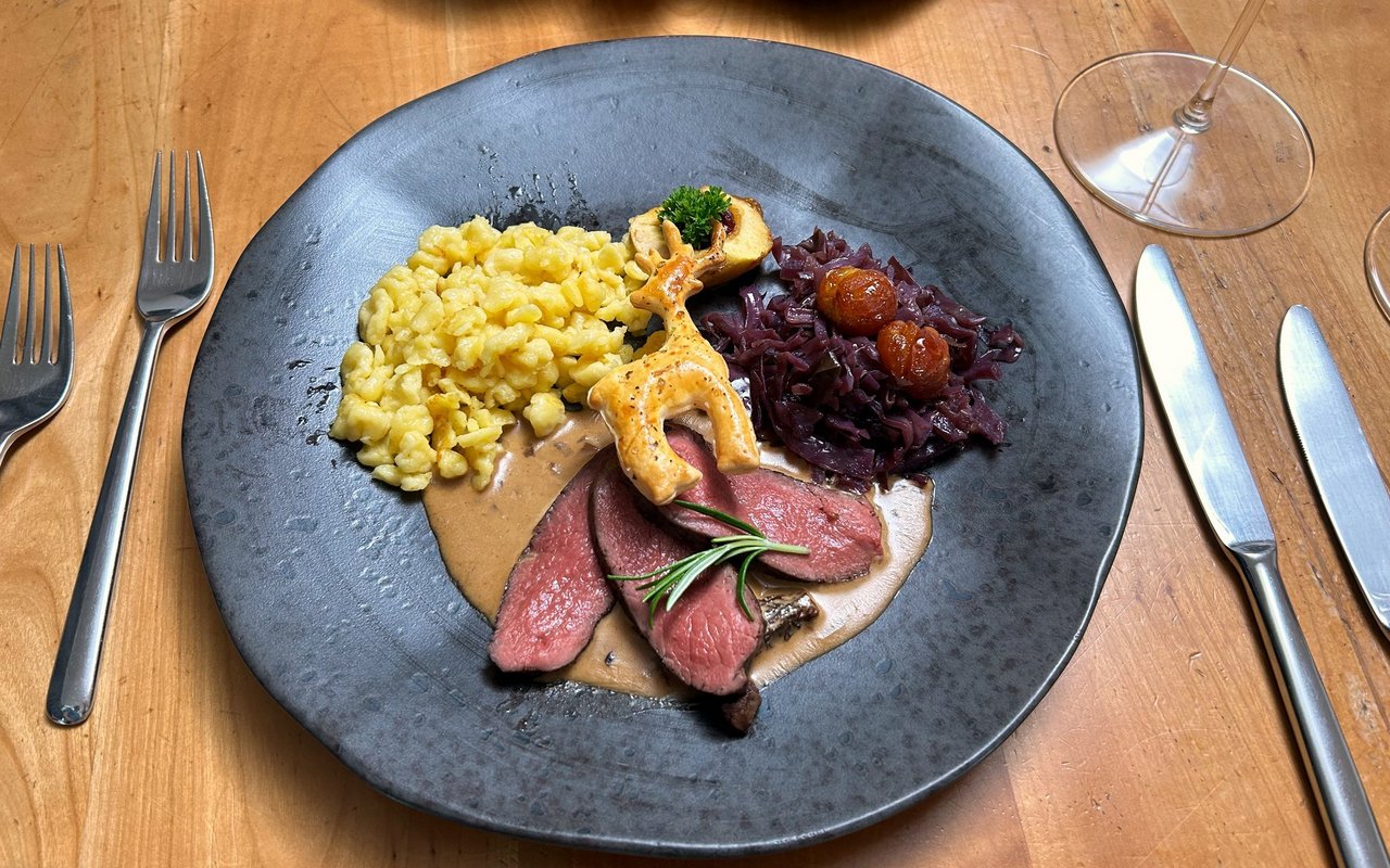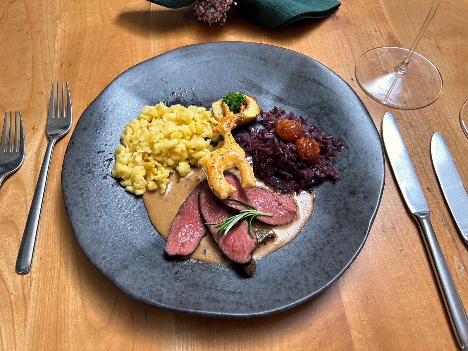 Vorgewärmte Teller bereitstellen. Mit der Wildrahmsauce einen Saucenspiegel bilden. Rehfilet in Tranchen schneiden und auf dem Saucenspiegel anrichten. Mit Sauce leicht beträufeln. IQuarkknöpflii und Rotkabis dazu anrichten. Je 2 Kastanien auf Rotkraut platzieren. Gefüllte Birnen dazu legen. Abrunden mit Rosmarinzweig auf dem Fleisch.