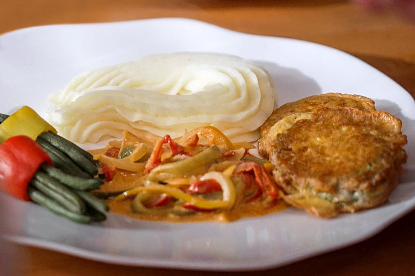 Das Kalbfleisch-Stroganoff auf vorgewärmte Teller anrichten. Den Kartoffelstock in einen Spritzsack füllen und neben dem Stroganoff einen Tropfen bilden. Bohnenpäckli dazu anrichten.