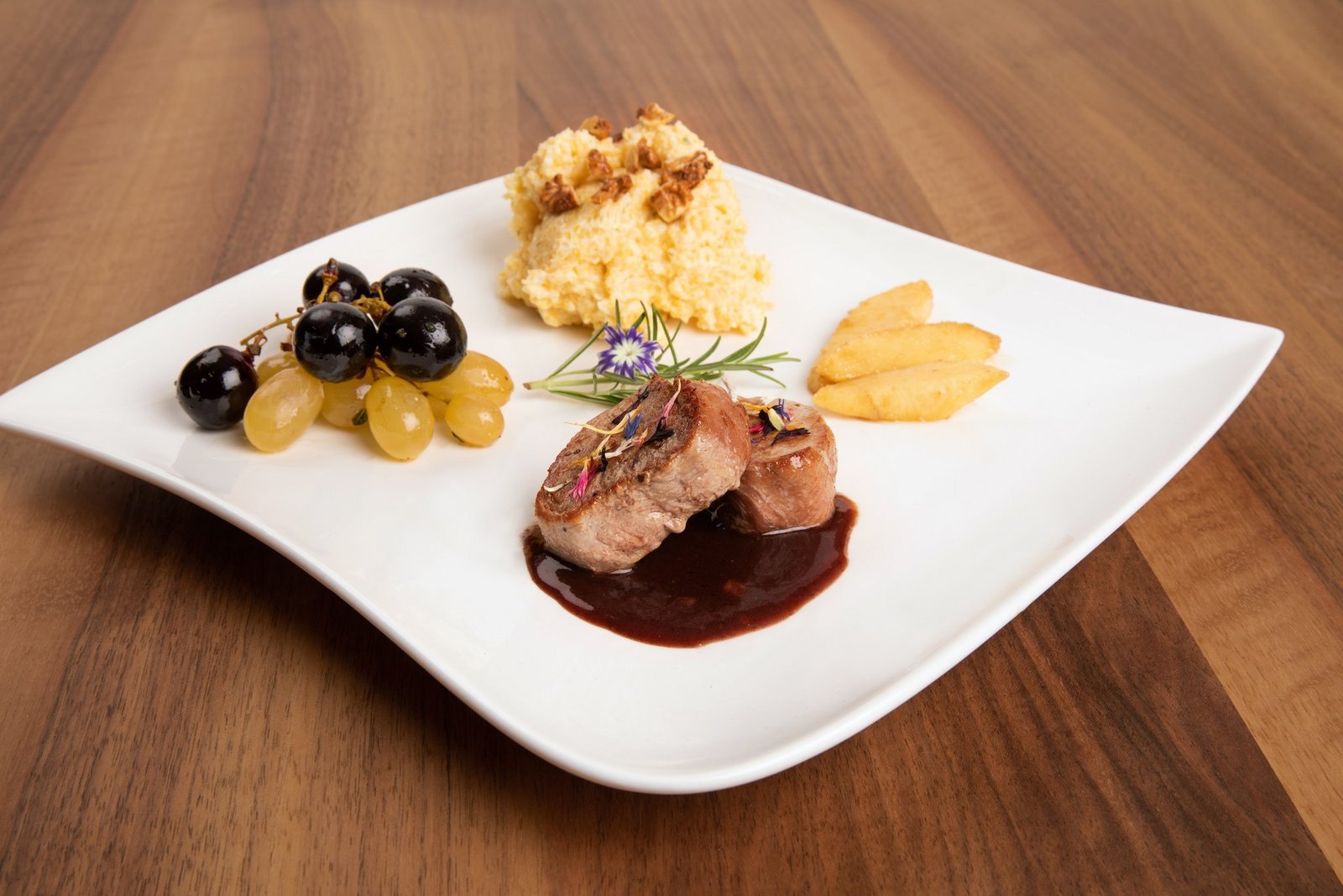 Mit der Sauce auf den vorgewärmten Tellern einen Saucenspiegel bilden. Je zwei Medaillons darin anrichten. Mit getrockneten Blüten bestreuen. Polenta, gebratene Trauben und karamellisierte Quittenschnitze dazu anrichten. Polenta mit gehackten Baumnüssen belegen.