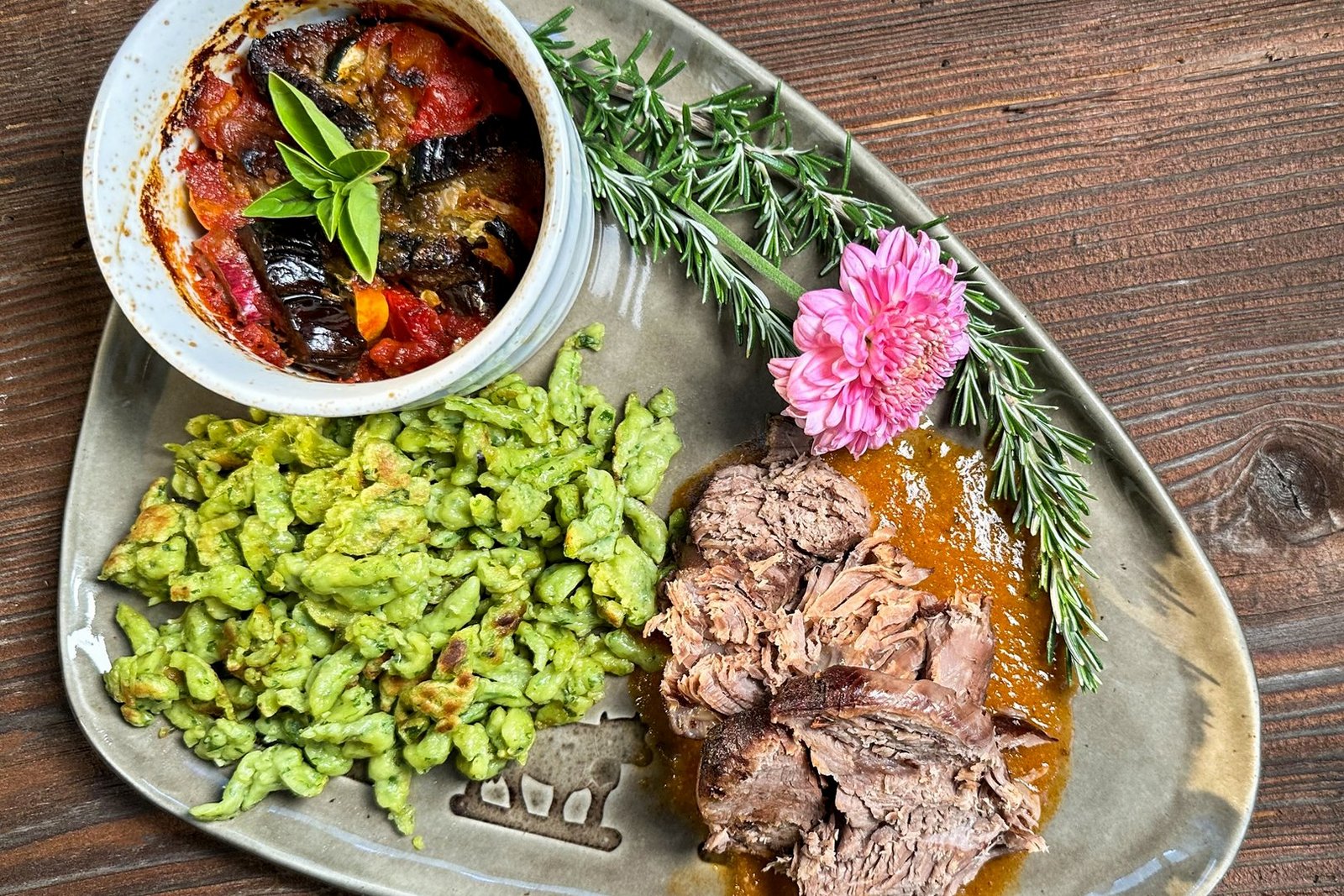 Den Kalbsschulterbraten mit einem scharfen Messer in Tranchen schneiden. Auf vorgewärmten Tellern mit der Sauce einen Saucenspiegel bilden. Je eine Tranche Kalbsschulterbraten darin anrichten. Portionenförmchen mit dem Ratatouille daneben platzieren. Kräuterknöpfli dazu anrichten. Mit frischen Kräutern und essbaren Blumen dekorieren.