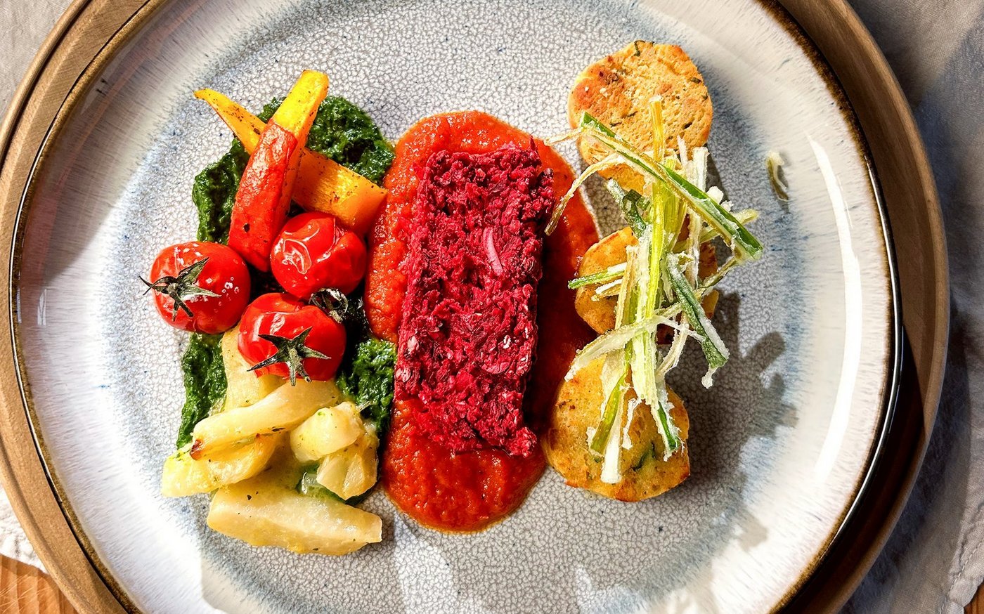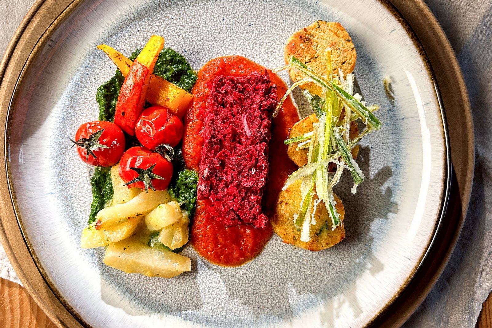Vom Fleisch-Menu Serviettenknödel, Petersilienpüree, Kohlrabi, Cherrytomaten und Kürbisschnitze dazu anrichten.